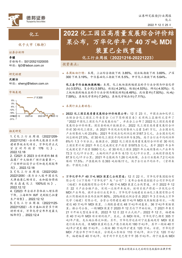 化工行业周报:2022化工园区高质量发展综合评价结果公布,万华化学年产40万吨MDI装置已全线贯通