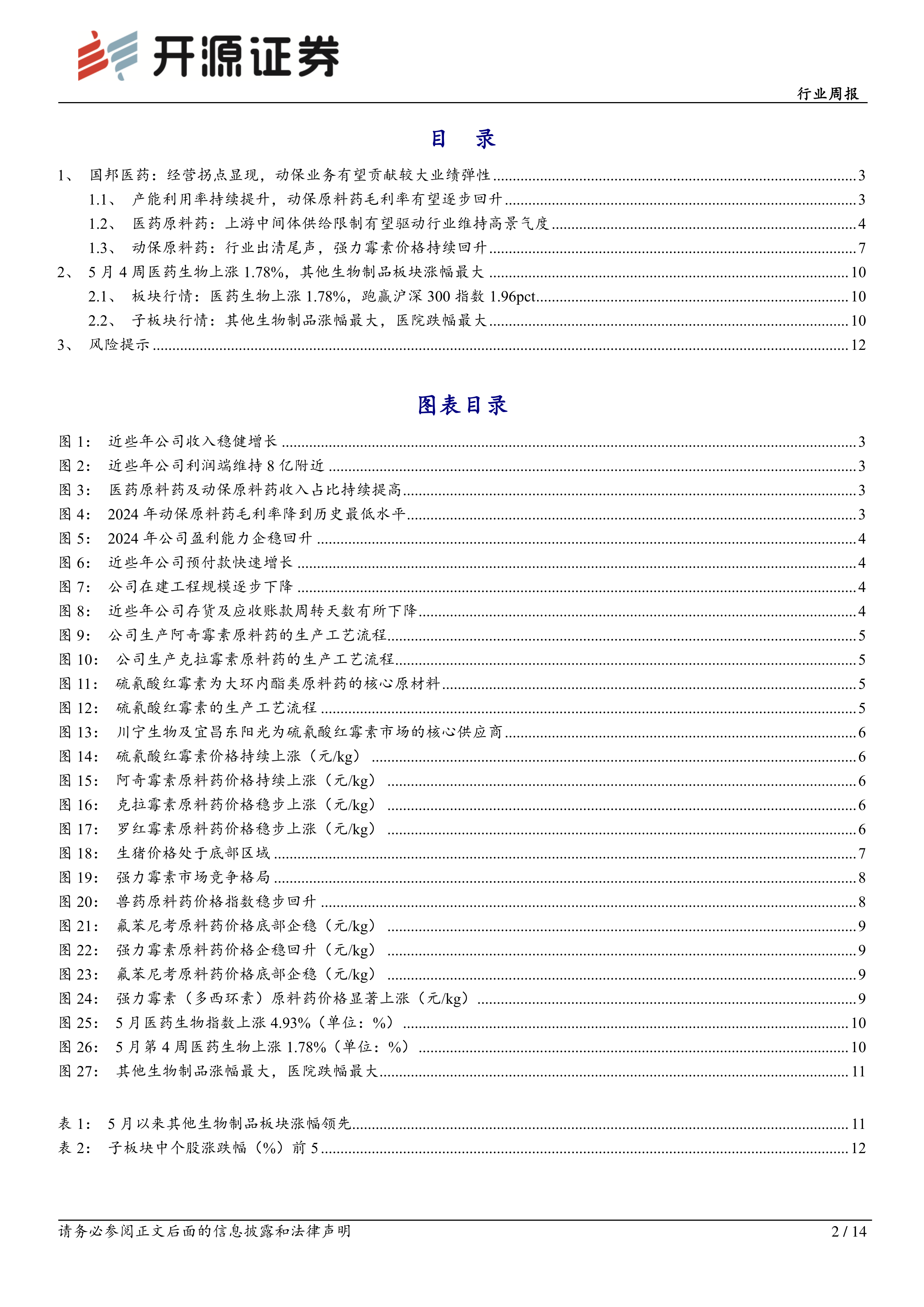 本报告对国邦医药的经营状况进行了深入分析,认为其正处于经营拐点,动保业务有望贡献较大业绩弹性。医药原料药业务的高景气度将持续为公司带来稳定收益,而动保原料药业务的复苏则将成为公司未来业绩增长的重要驱动力。报告同时提供了医药生物行业整体的市场走势,为投资者提供了更全面的信息参考。 然而,报告也提示了政策落地不及预期、行业整合不及预期以及行业竞争格局恶化等风险因素,投资者需谨慎评估风险。