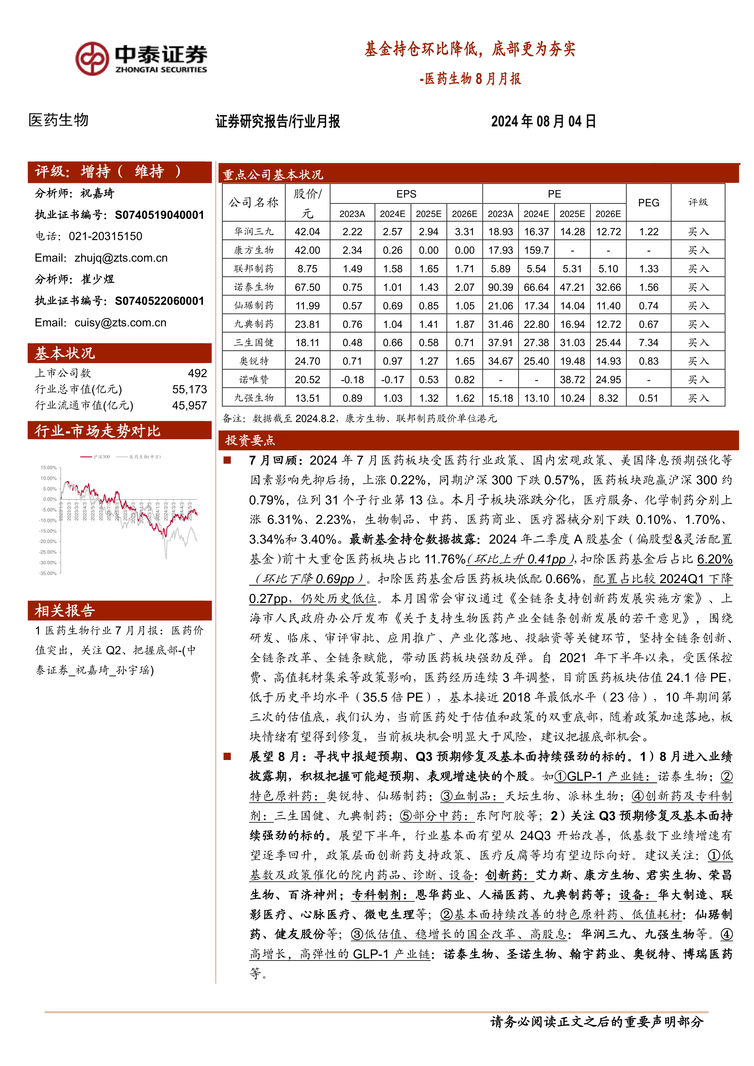 展望8月:寻找中报超预期、Q3预期修复及基本面持续强劲的标的。1)8月进入业绩披露期,积极把握可能超预期、表观增速快的个股。如①GLP-1产业链:诺泰生物;②特色原料药:奥锐特、仙琚制药;③血制品:天坛生物、派林生物;④创新药及专科制剂:三生国健、九典制药;⑤部分中药:东阿阿胶等;2)关注Q3预期修复及基本面持续强劲的标的。展望下半年,行业基本面有望从24Q3开始改善,低基数下业绩增速有望逐季回升,政策层面创新药支持政策、医疗反腐等均有望边际向好。建议关注:①低基数及政策催化的院内药品、诊断、设备:创新药:艾力斯、康方生物、君实生物、荣昌生物、百济神州;专科制剂:恩华药业、人福医药、九典制药等;设备:华大制造、联影医疗、心脉医疗、微电生理等;②基本面持续改善的特色原料药、低值耗材:仙琚制药、健友股份等;③低估值、稳增长的国企改革、高股息:华润三九、九强生物等。④高增长,高弹性的GLP-1产业链:诺泰生物、圣诺生物、翰宇药业、奥锐特、博瑞医药等。