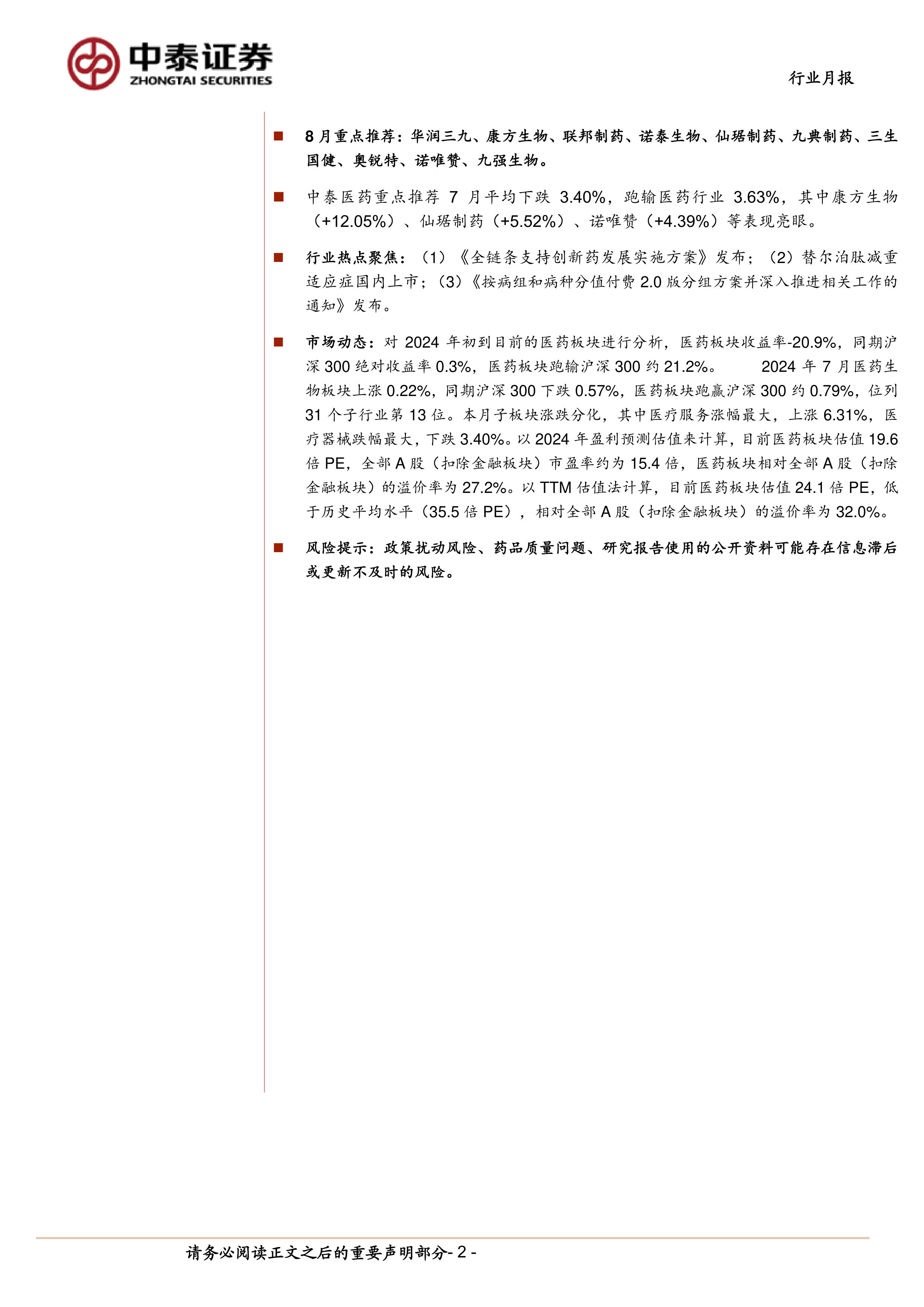 7月回顾:2024年7月医药板块受医药行业政策、国内宏观政策、美国降息预期强化等因素影响先抑后扬,上涨0.22%,同期沪深300下跌0.57%,医药板块跑赢沪深300约0.79%,位列31个子行业第13位。本月子板块涨跌分化,医疗服务、化学制药分别上涨6.31%、2.23%,生物制品、中药、医药商业、医疗器械分别下跌0.10%、1.70%、3.34%和3.40%。最新基金持仓数据披露:2024年二季度A股基金(偏股型&灵活配置基金)前十大重仓医药板块占比11.76%(环比上升0.41pp),扣除医药基金后占比6.20%(环比下降0.69pp)。扣除医药基金后医药板块低配0.66%,配置占比较2024Q1下降0.27pp,仍处历史低位。本月国常会审议通过《全链条支持创新药发展实施方案》、上海市人民政府办公厅发布《关于支持生物医药产业全链条创新发展的若干意见》,围绕研发、临床、审评审批、应用推广、产业化落地、投融资等关键环节,坚持全链条创新、全链条改革、全链条赋能,带动医药板块强劲反弹。自2021年下半年以来,受医保控费、高值耗材集采等政策影响,医药经历连续3年调整,目前医药板块估值24.1倍PE,低于历史平均水平(35.5倍PE),基本接近2018年最低水平(23倍),10年期间第三次的估值底,我们认为,当前医药处于估值和政策的双重底部,随着政策加速落地,板块情绪有望得到修复,当前板块机会明显大于风险,建议把握底部机会。