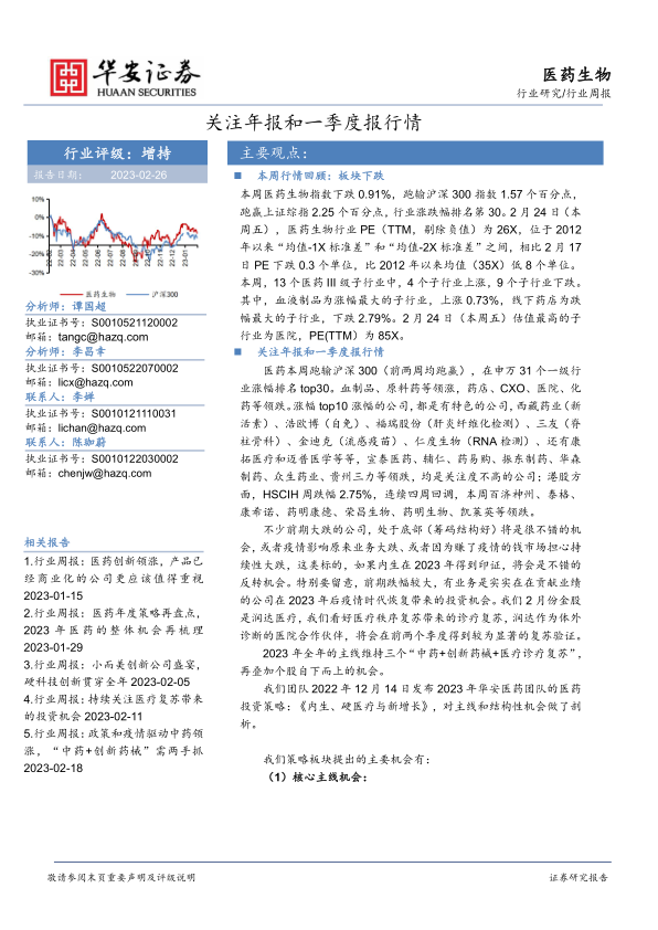 报告建议关注年报和一季度报行情,并指出2023年全年的投资主线为“中药+创新药械+医疗诊疗复苏”,同时需关注个股自下而上的机会。