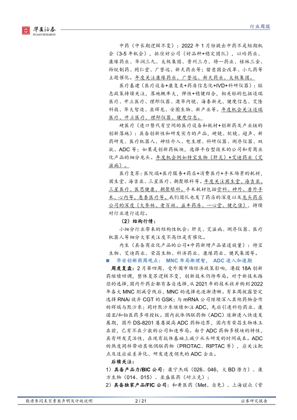 中药(中长期逻辑不变):2022年1月份提出中药不是短期机会(3-5年机会),抓住好公司(好品种+稳定团队),以岭药业、康缘药业、华润三九、太极集团、贵州三力、特一药业、桂林三金、羚锐制药、同仁堂、广誉远、新天药业等;留意国企改革、小儿药等主题催化。年度关注康缘药业、广誉远、新天药业、太极集团。