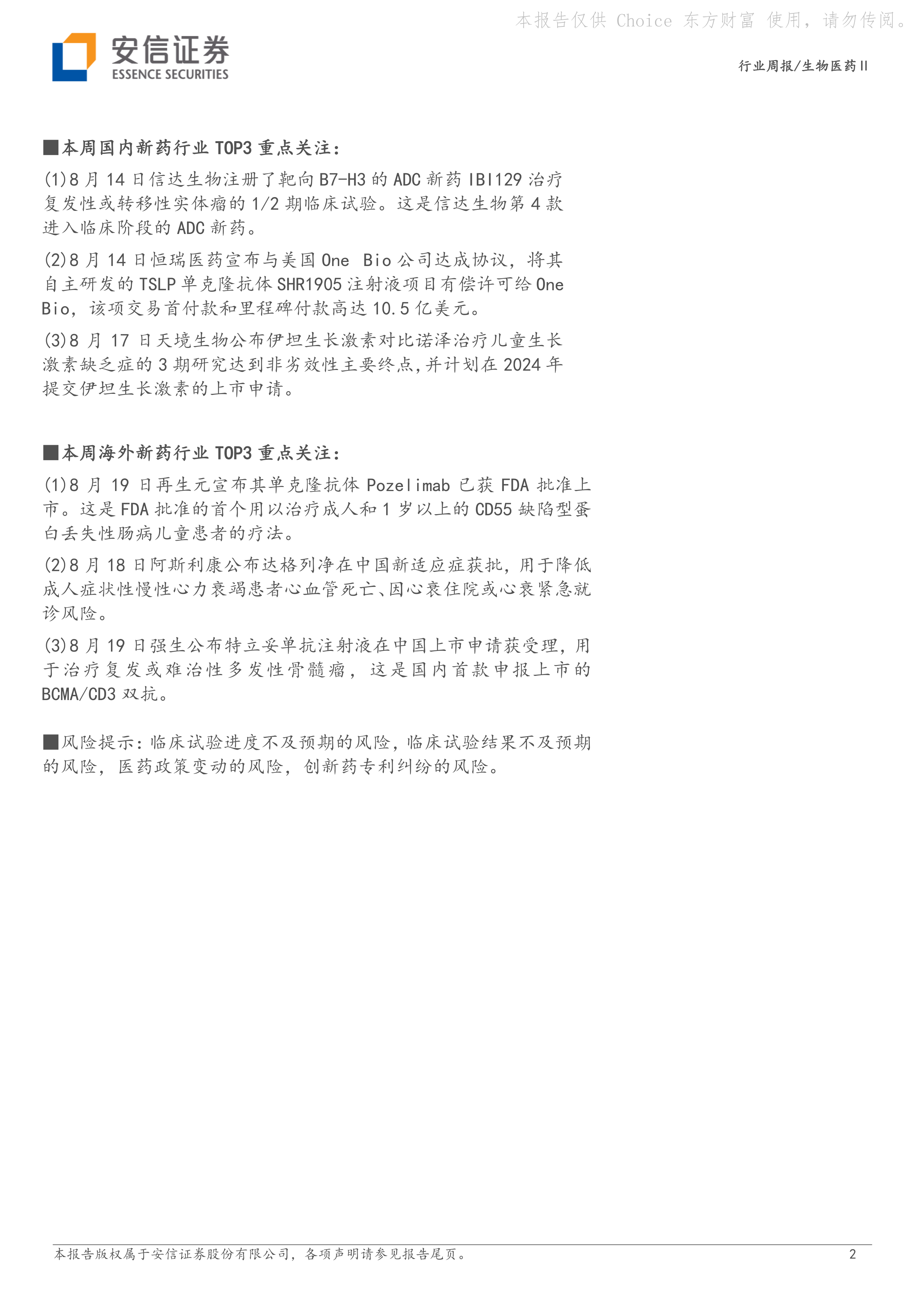 报告最后列出了生物医药行业面临的主要风险,包括临床试验进度不及预期、临床试验结果不及预期、医药政策变动以及创新药专利纠纷等。