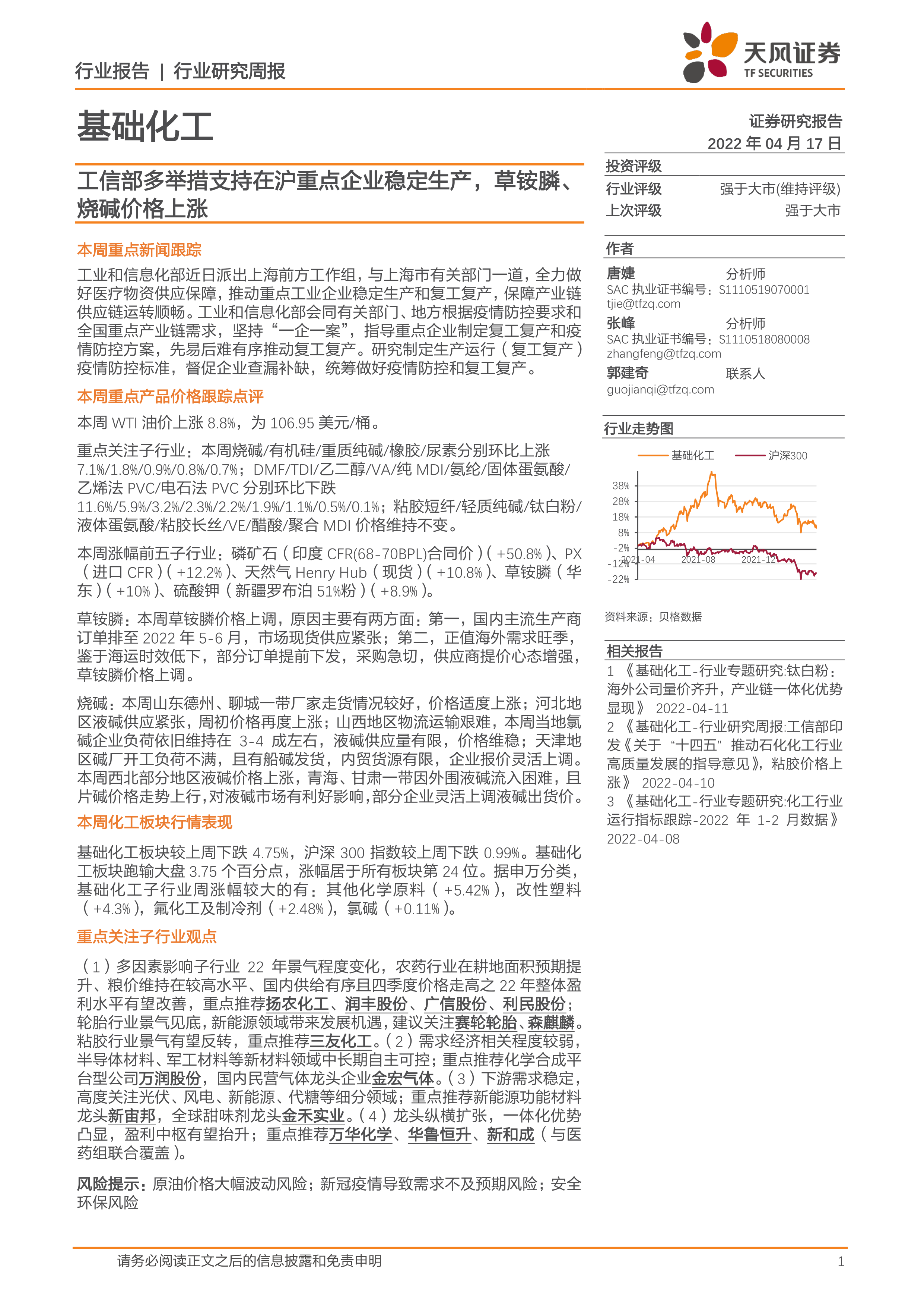 基础化工行业研究周报:工信部多举措支持在沪重点企业稳定生产,草铵膦、烧碱价格上涨