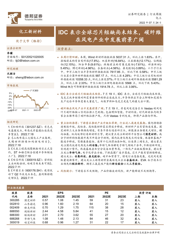 化工新材料行业周报:IDC表示全球芯片短缺尚未结束,碳纤维在风电产业中发展前景广阔