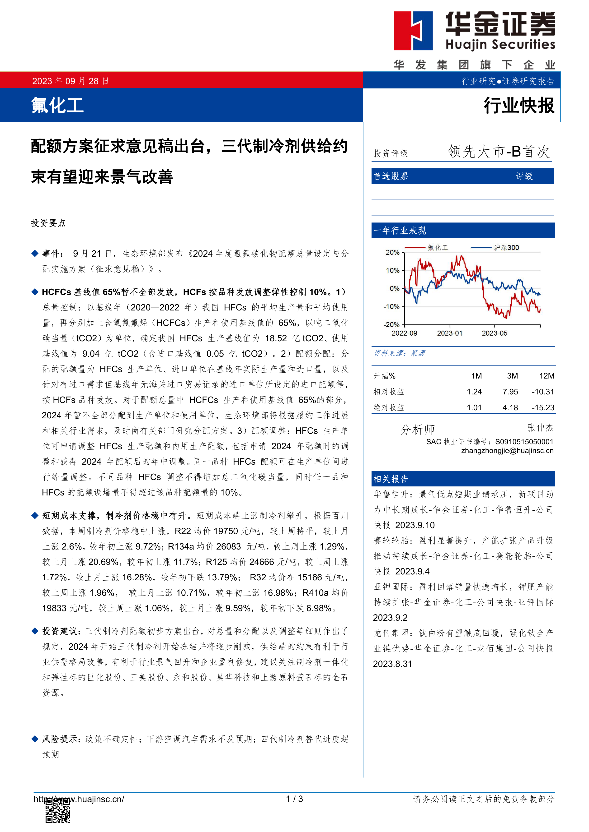 氟化工行业快报:配额方案征求意见稿出台,三代制冷剂供给约束有望迎来景气改善