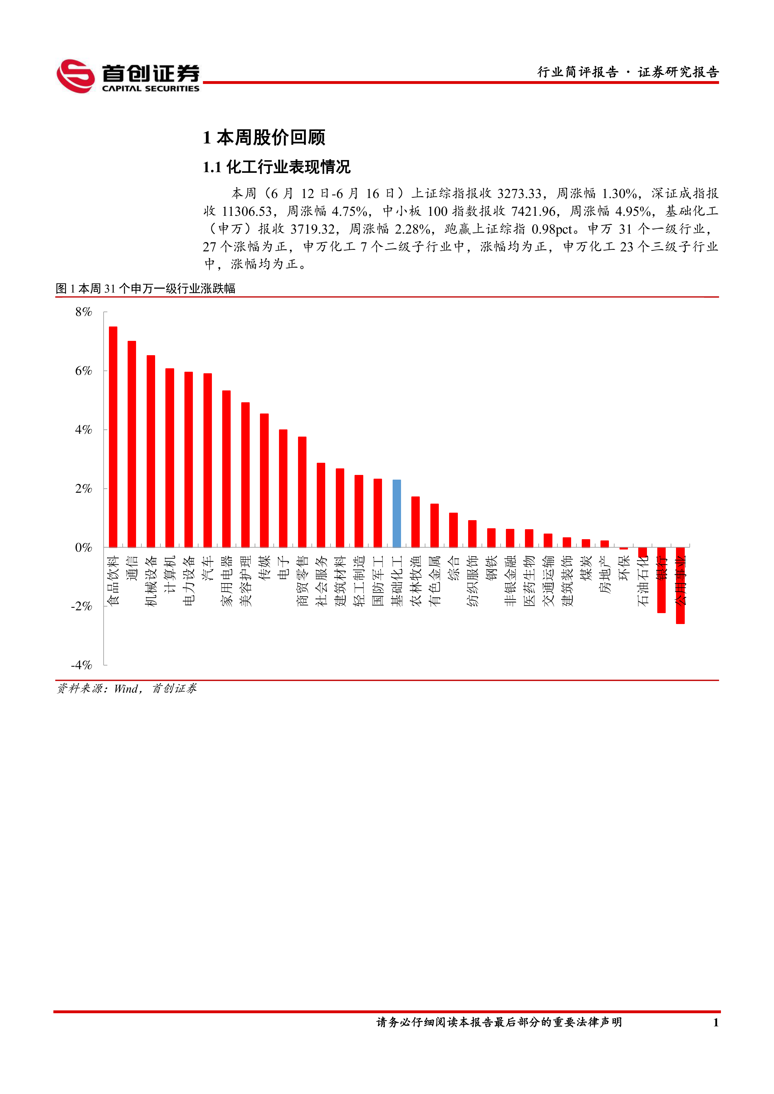 本周化工板块表现:本周(6月12日-6月16日)上证综指报收3273.33,周涨幅1.30%,深证成指报收11306.53,周涨幅4.75%,中小板100指数报收7421.96,周涨幅4.95%,基础化工(申万)报收3719.32,周涨幅2.28%,跑赢上证综指0.98pct。申万31个一级行业,27个涨幅为正,申万化工7个二级子行业中,涨幅均为正,申万化工23个三级子行业中,涨幅均为正。本周化工行业404家上市公司中,有286家涨幅为正。涨幅居前的个股有华西股份、*ST榕泰、黑猫股份、江盐集团、科创新源、东材科技、双星新材、新金路、航锦科技、ST宏达等。