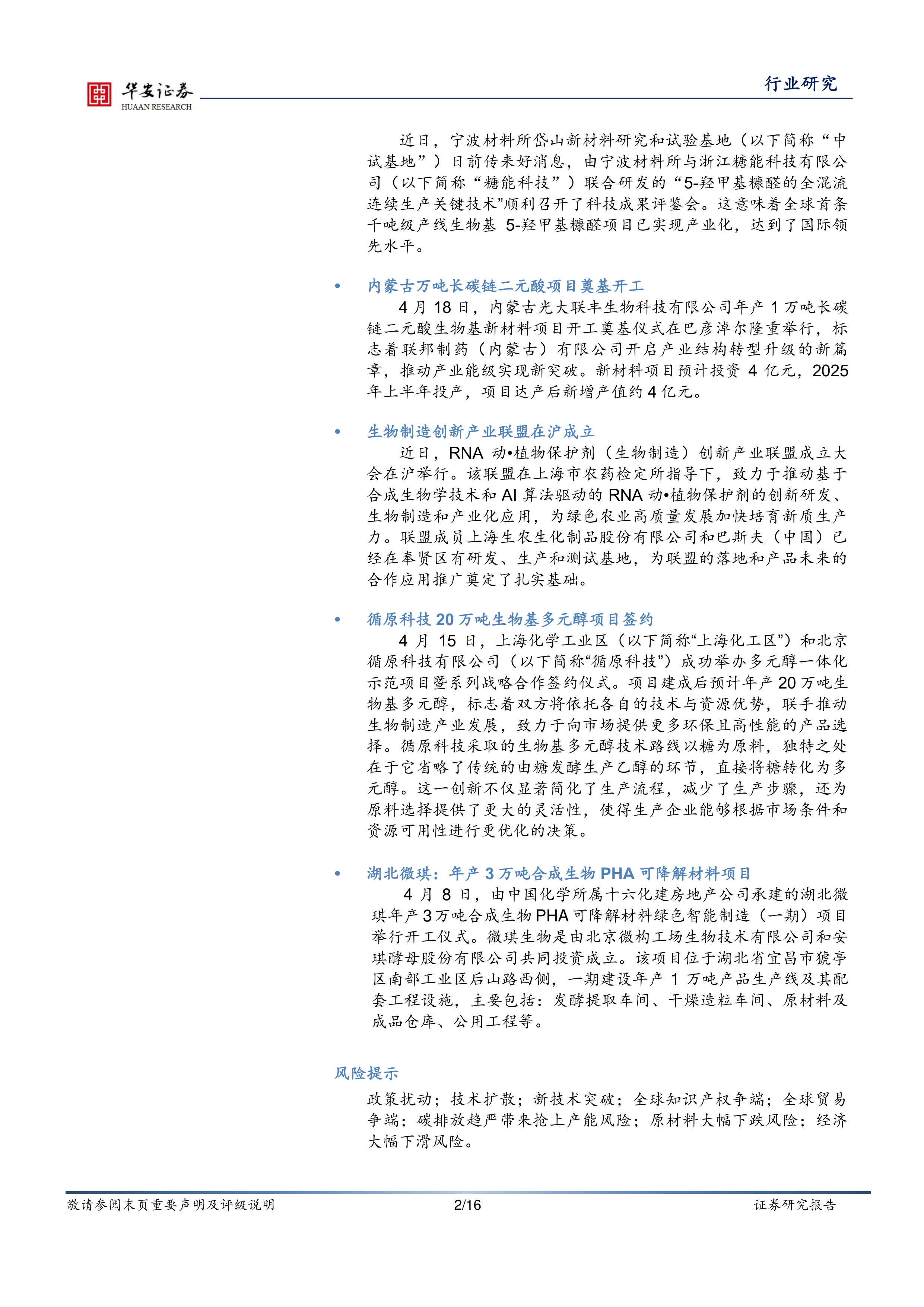 最后,报告列出了合成生物学行业面临的风险,包括政策扰动、技术扩散、新技术突破、全球知识产权争端、全球贸易争端、碳排放趋严、原材料价格波动以及经济下行等。