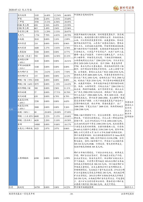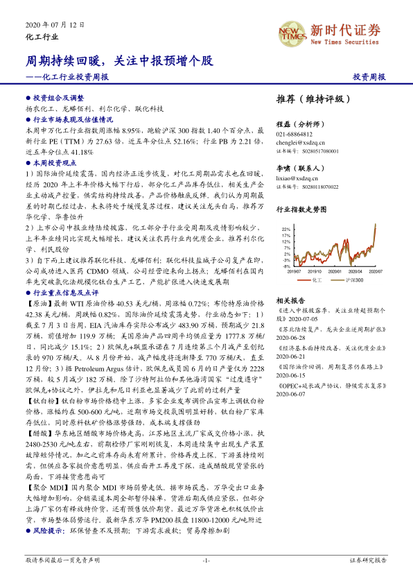 本报告基于对2020年7月化工行业市场数据的分析,指出化工行业周期已见底,正处于缓慢复苏阶段。部分子行业,特别是农药行业,业绩增长显著。报告推荐了多个值得关注的化工龙头企业和优质个股,并对主要化工产品的市场动态和未来走势进行了预测,同时提示了行业投资风险。 投资者应结合自身风险承受能力和投资目标,谨慎决策。