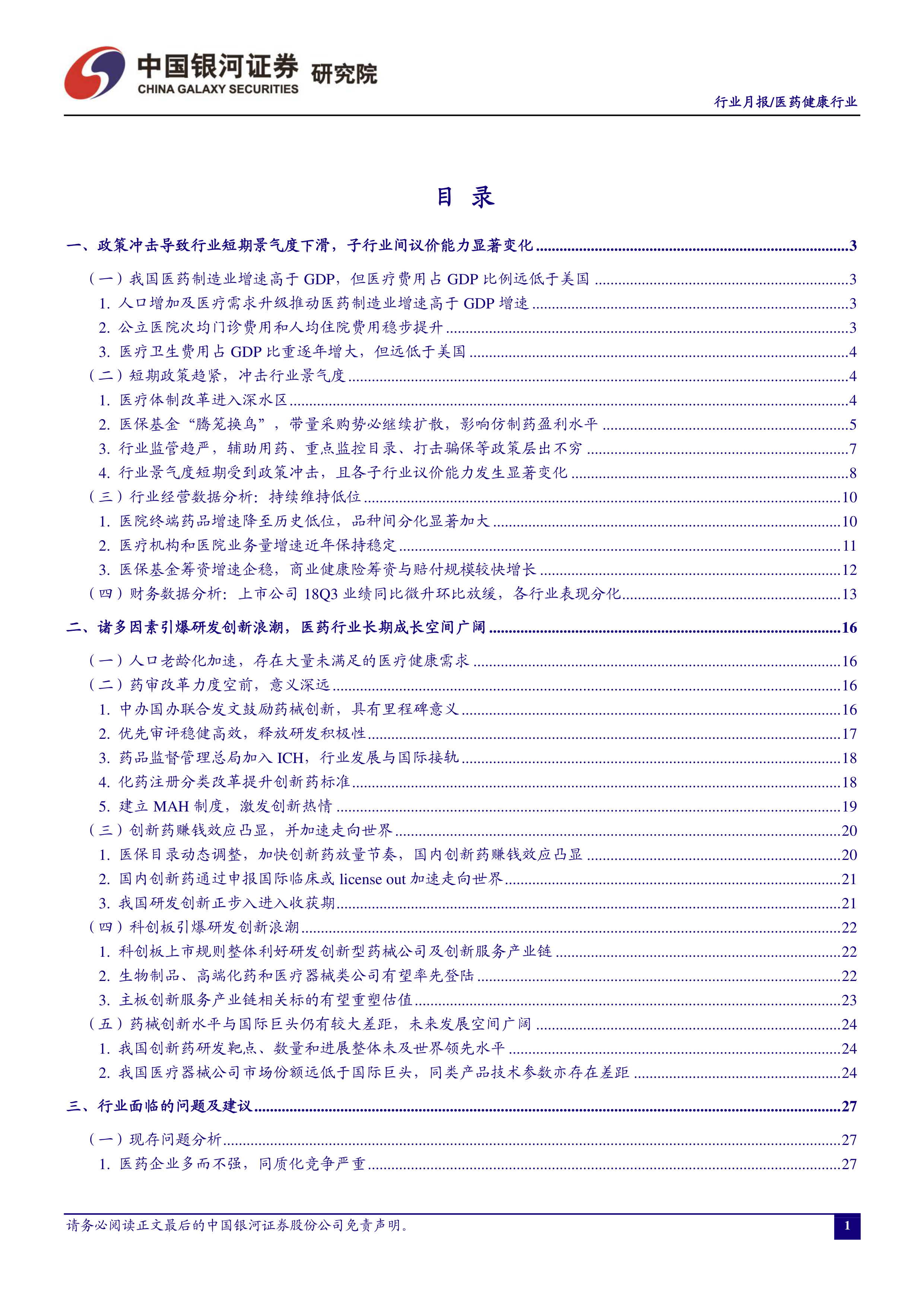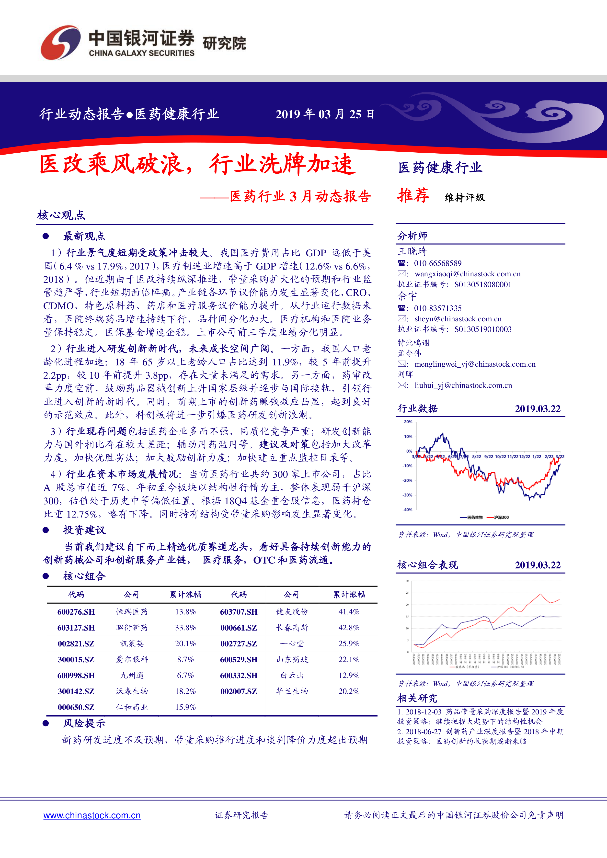这份报告对2019年3月医药健康行业进行了全面的分析,既指出了短期内政策冲击带来的行业阵痛,也强调了长期来看人口老龄化、药审改革以及创新驱动带来的巨大发展机遇。报告通过大量数据和图表,对行业现状、发展趋势以及投资策略进行了深入分析,为投资者提供了有价值的参考信息。 报告同时指出了行业面临的挑战和风险,提醒投资者注意潜在风险。 总而言之,报告认为,在经历短期阵痛后,具备持续创新能力的企业将在医药行业新时代中获得长足发展。