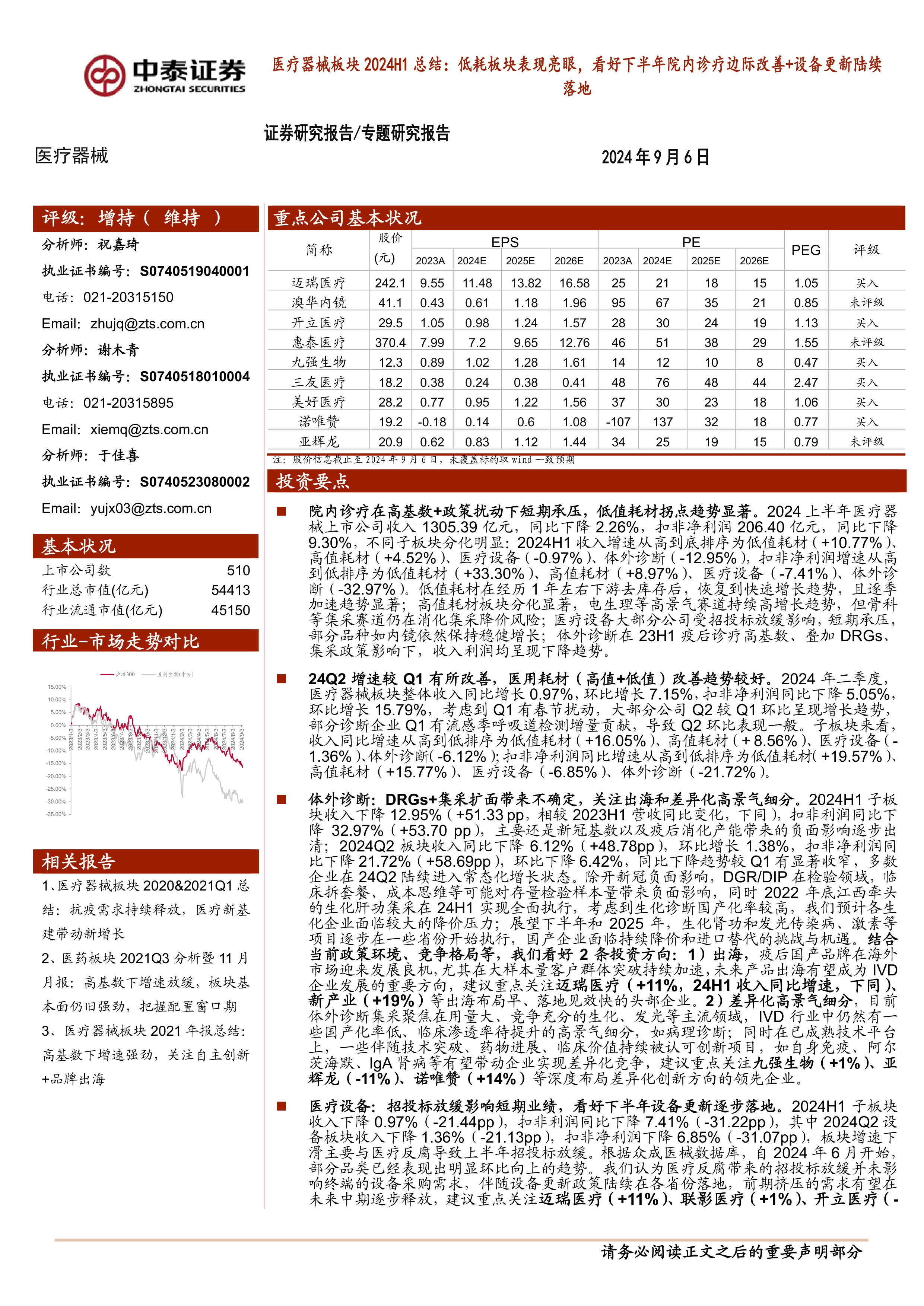 本报告对2024年上半年医疗器械板块进行了全面分析,内容涵盖板块整体表现、细分领域业绩分析以及投资建议等方面。