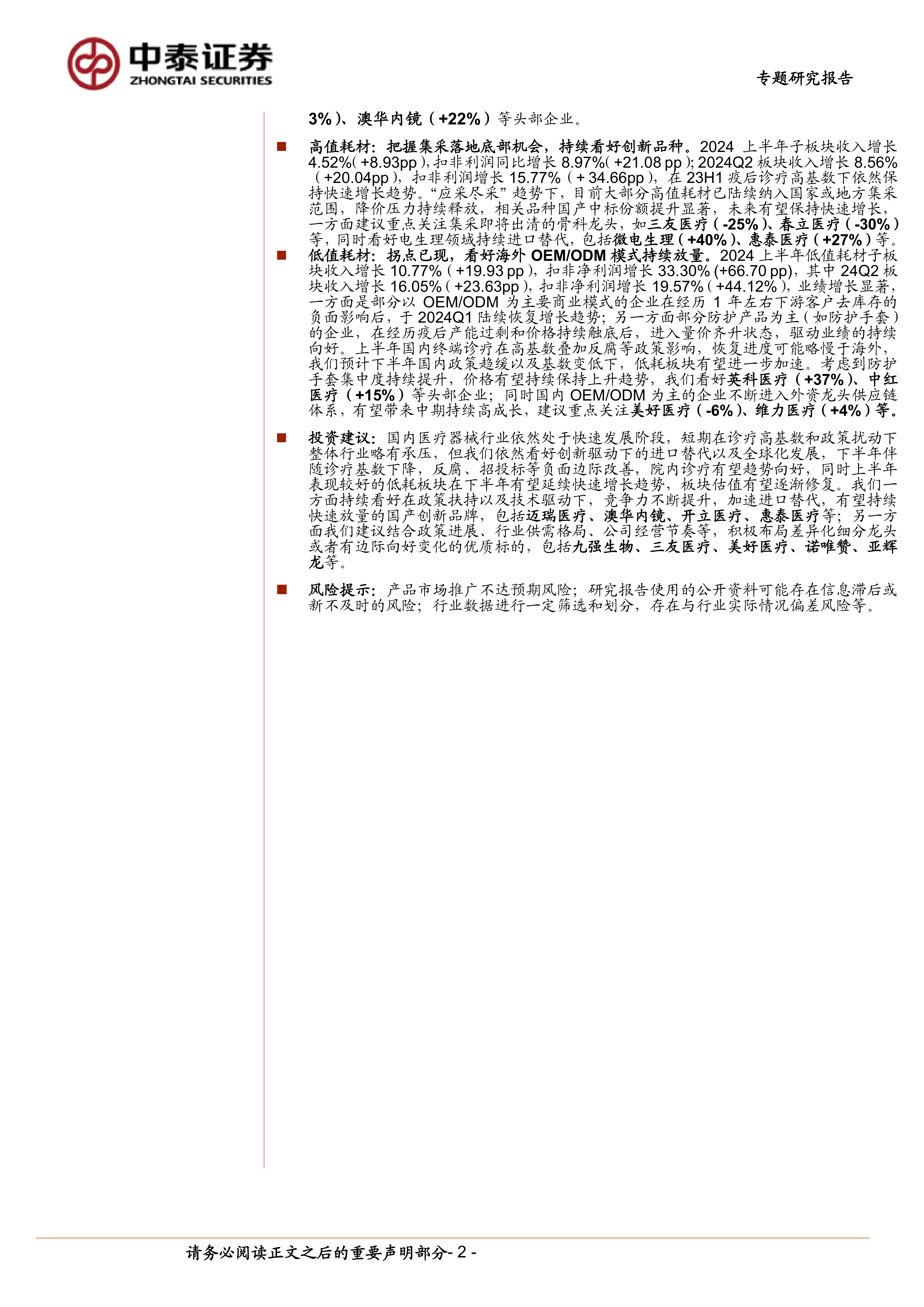 展望下半年,随着诊疗基数下降、反腐和招投标放缓等负面影响边际改善,院内诊疗有望向好,低值耗材板块有望延续快速增长。报告建议关注创新驱动下的进口替代和全球化发展,重点关注在政策扶持和技术驱动下,竞争力不断提升、加速进口替代并有望持续快速放量的国产创新品牌,以及在差异化细分领域具有龙头地位或有边际向好变化的优质标的。