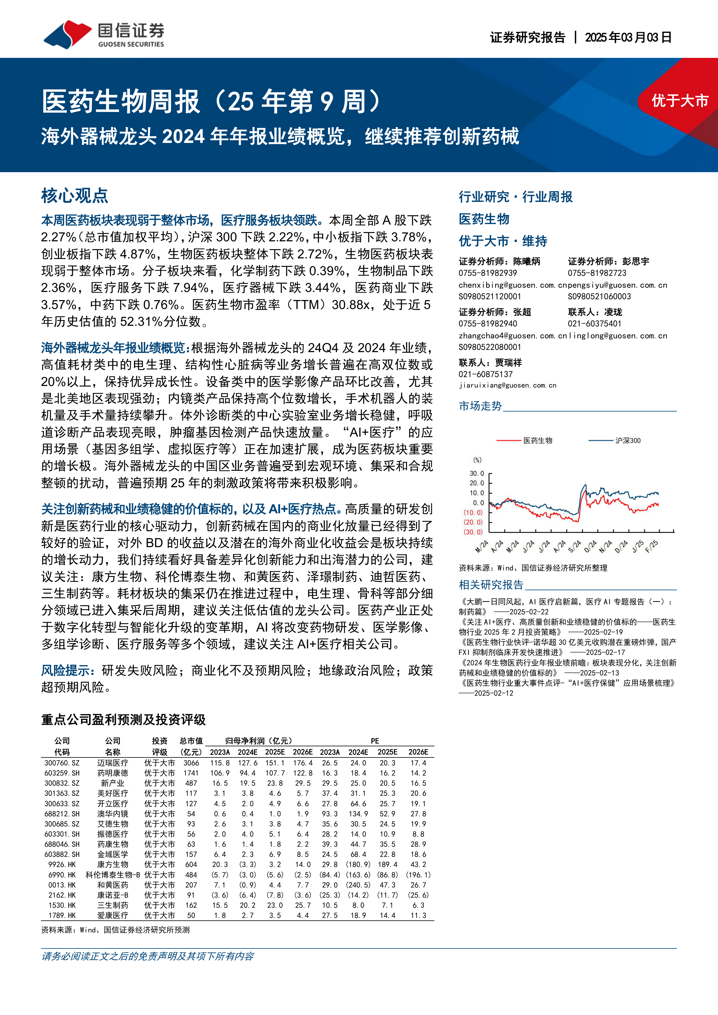 本报告对本周医药板块市场表现进行了总结,并深入分析了多家海外器械龙头公司的年报业绩,揭示了高值耗材和部分设备类产品保持较快增长,以及“AI+医疗”的蓬勃发展。报告认为,创新药械、低估值龙头公司和AI+医疗领域蕴藏着重要的投资机会,并据此提出了相应的投资策略和推荐标的,同时提醒投资者注意潜在的投资风险。 报告数据主要来自Wind和国信证券经济研究所。