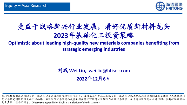 2023年基础化工投资策略:受益于战略新兴行业发展,看好优质新材料龙头