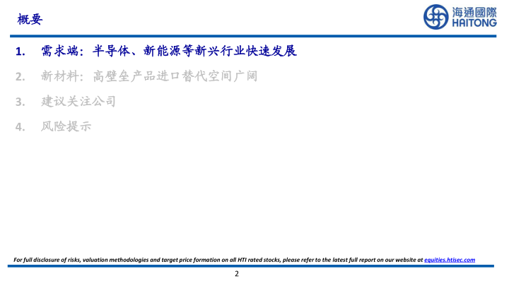 本报告基于海通国际的研究,对中国新材料行业市场现状及未来发展趋势进行了深入分析。报告指出,战略性新兴产业的快速发展为新材料行业提供了巨大的市场机遇,国产替代空间广阔。报告推荐的六家新材料龙头企业,凭借其技术或品牌壁垒、以及积极的扩张和研发策略,有望在未来持续受益于行业发展,实现业绩增长。 然而,投资者仍需关注报告中提到的风险因素,谨慎投资。 报告中提供的图表数据和财务指标,为投资者提供了较为全面的信息支持,有助于投资者做出更明智的投资决策。