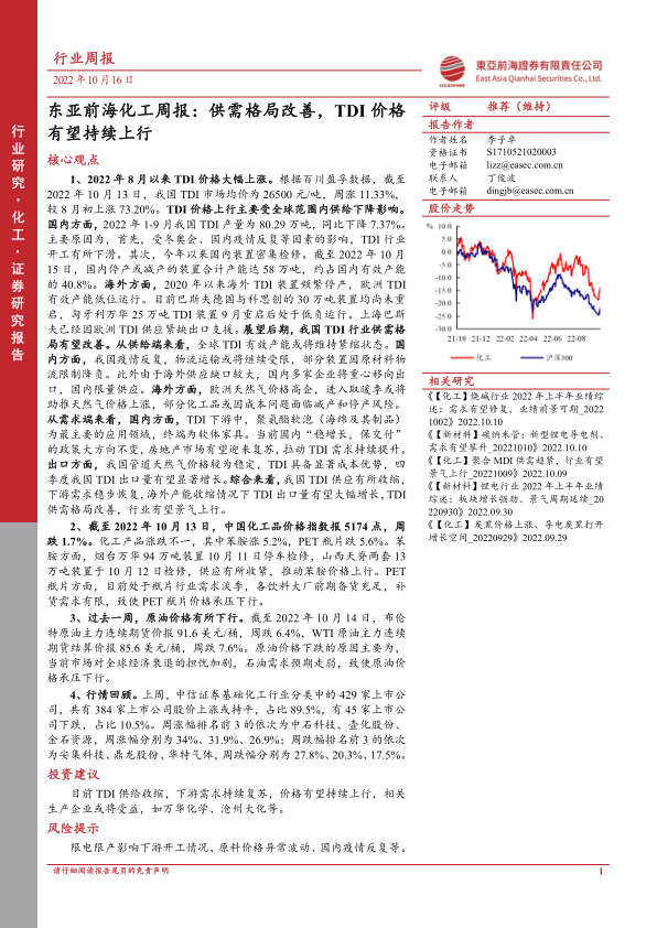 本报告的核心观点是:2022年8月以来,受全球供给下降和国内外多种因素影响,TDI价格大幅上涨,涨幅达73.20%。但同时,下游需求稳步恢复,且中国TDI具备显著成本优势,四季度出口量有望显著增长,因此TDI供需格局有望改善,行业景气度有望上行。 具体而言,报告从供需两端、原油价格及市场整体走势等方面进行了数据分析,并对相关上市公司进行了投资建议。