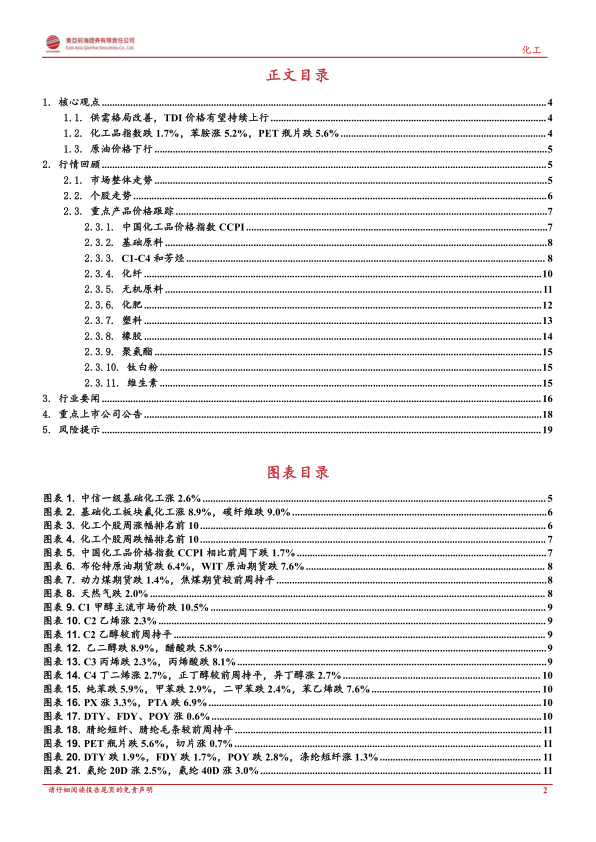 本报告通过对TDI市场供需格局、化工品价格指数、原油价格以及化工行业市场表现的综合分析,得出结论:TDI价格有望持续上行,行业景气度有望提升。报告同时指出了限电限产、原料价格波动和疫情反复等潜在风险。 报告中大量的数据和图表为分析提供了有力支撑,为投资者提供了较为全面的市场信息和投资建议,但投资者仍需谨慎评估风险,并结合自身情况做出投资决策。