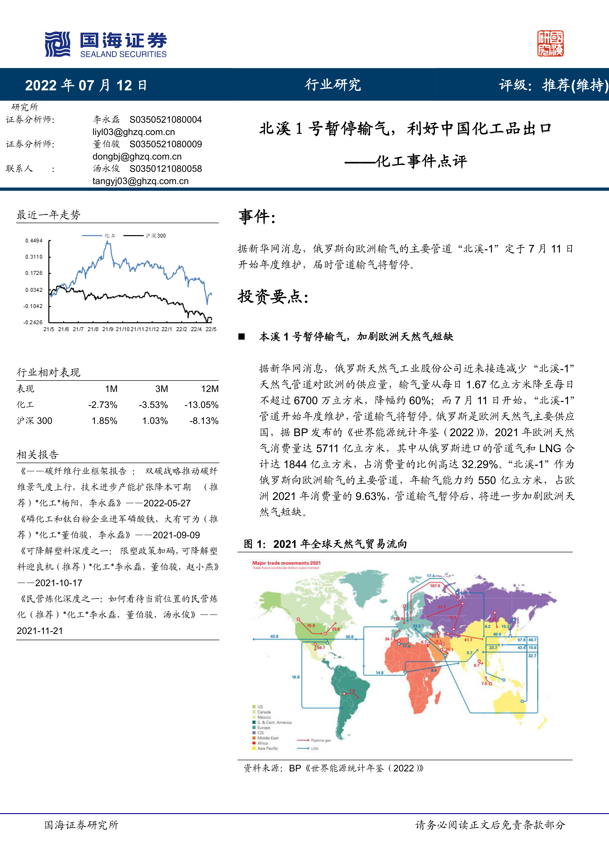 化工事件点评:北溪1号暂停输气,利好中国化工品出口