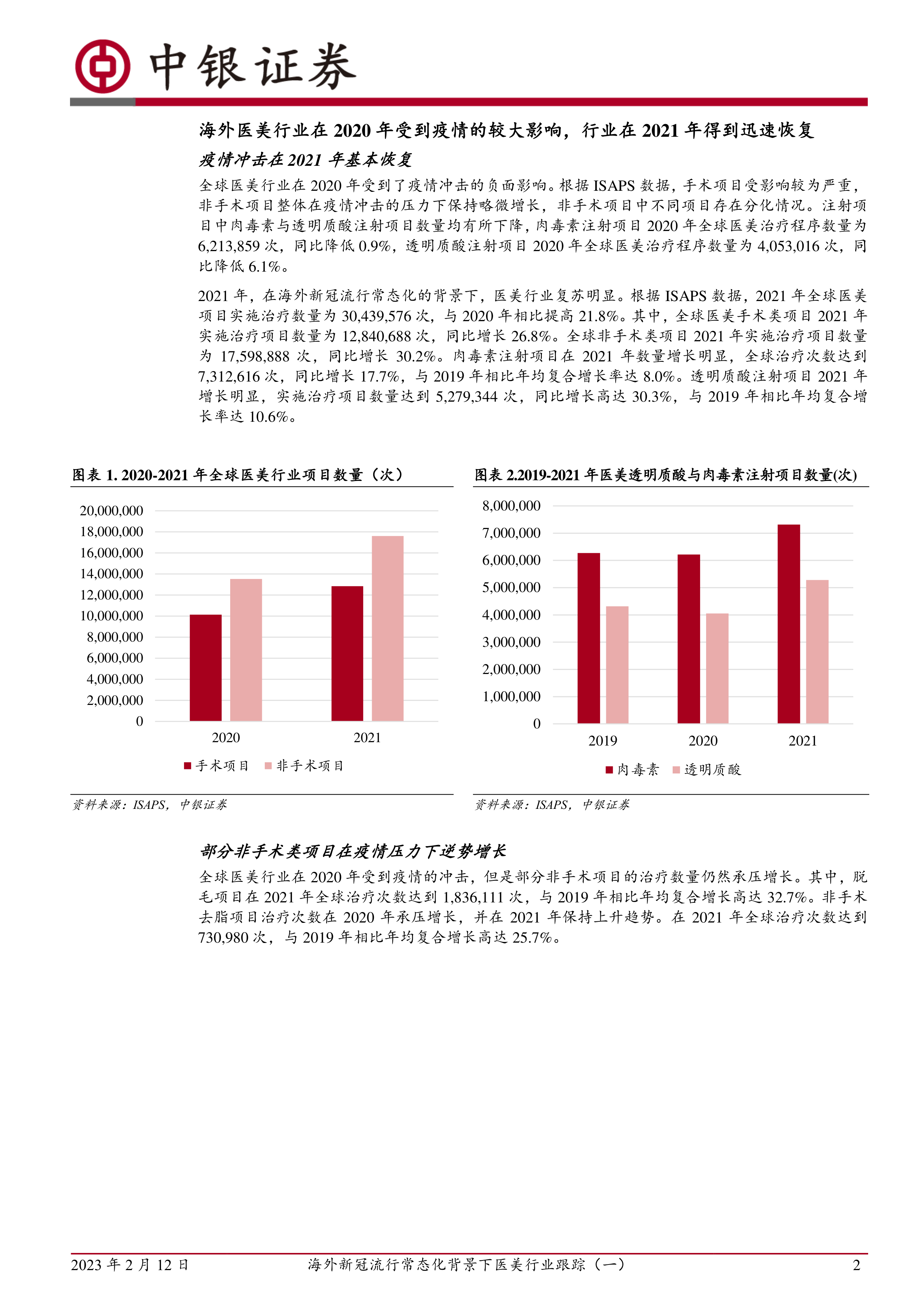 报告首先分析了2020-2021年全球医美行业受疫情影响的情况。2020年,全球医美手术项目受影响严重,非手术项目整体略微增长,但肉毒素和透明质酸注射项目数量下降。2021年,行业复苏明显,手术和非手术项目均大幅增长,肉毒素和透明质酸注射项目增速尤其显著,脱毛和非手术去脂项目也逆势增长。报告提供了ISAPS数据支持,清晰地展现了项目数量的同比和复合增长率。图表1和图表2直观地展现了2020-2021年全球医美项目数量以及2019-2021年医美透明质酸与肉毒素注射项目数量的变化趋势。图表3则显示了2020-2021年脱毛项目与非手术类去脂项目治疗程序次数的增长情况。