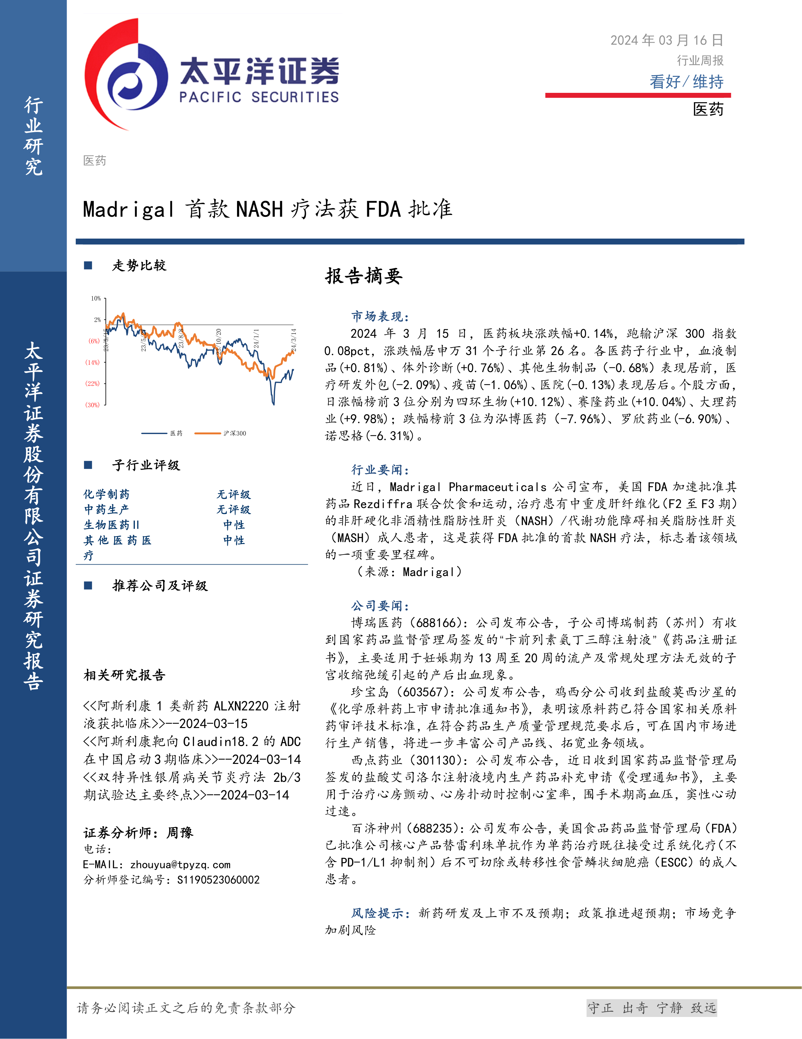 医药行业周报:Madrigal首款NASH疗法获FDA批准