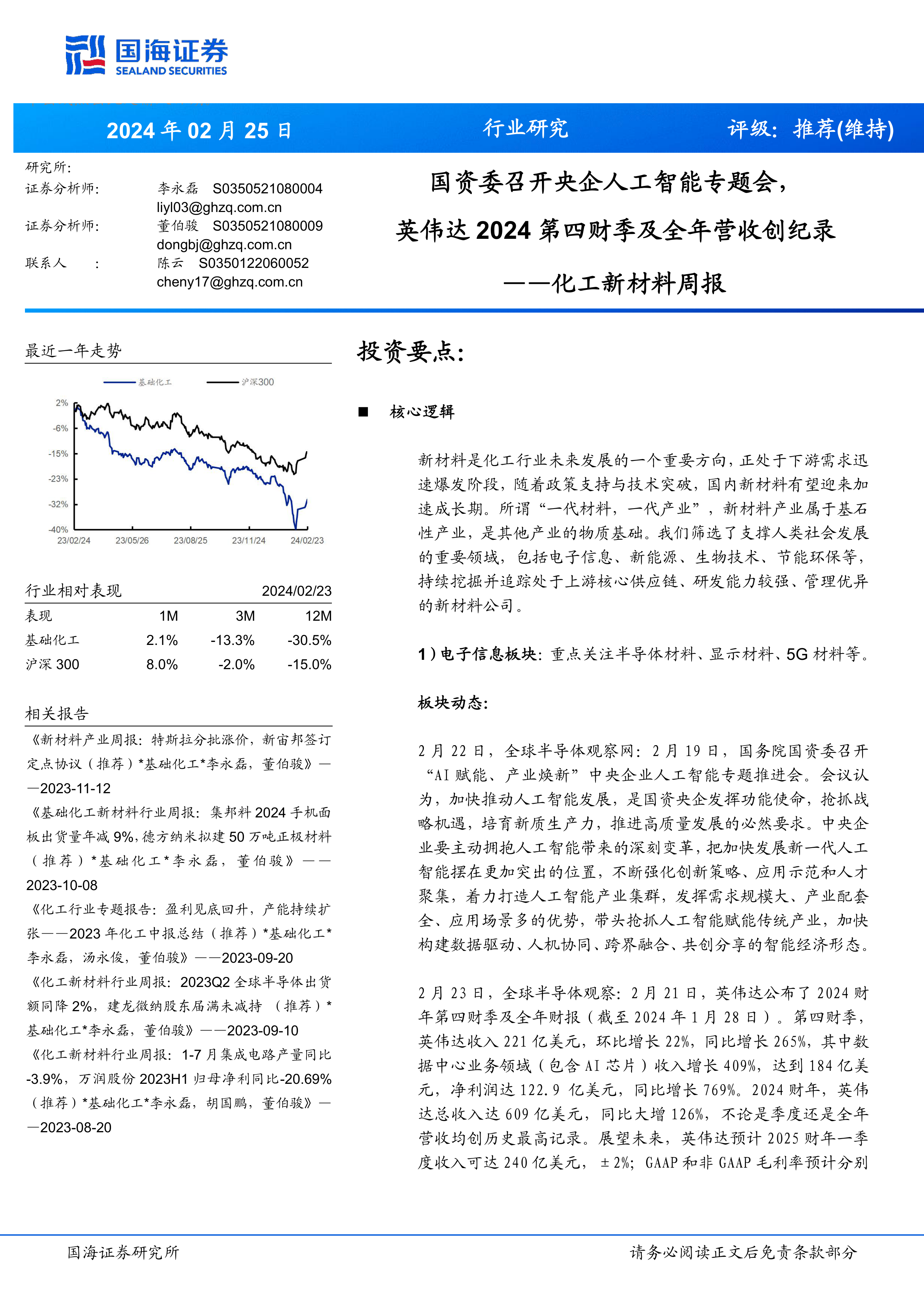 化工新材料周报:国资委召开央企人工智能专题会,英伟达第四财季及全年营收创纪录2024