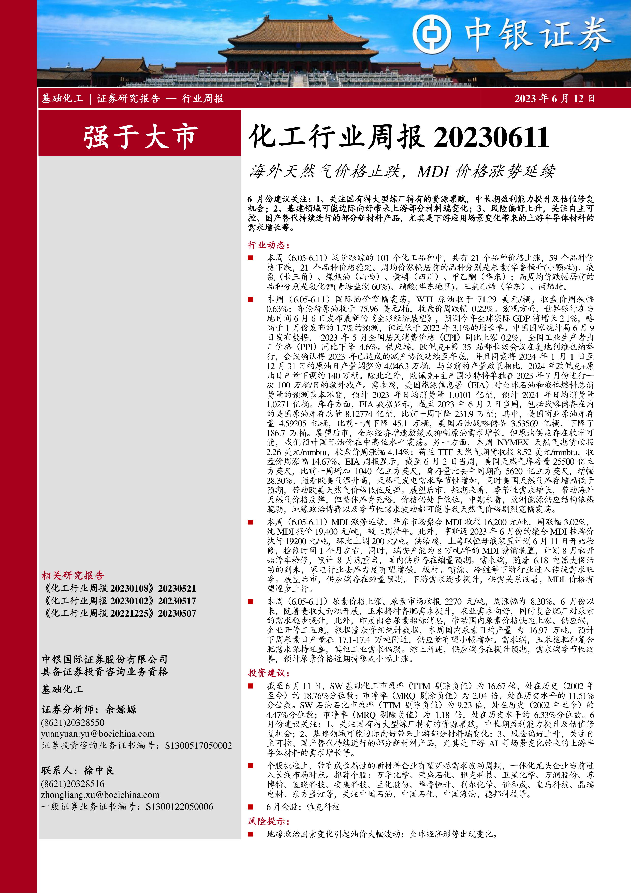 截至 6 月 11 日, SW 基础化工市盈率( TTM 剔除负值)为 16.67 倍,处在历史( 2002 年至今)的 18.76%分位数;市净率( MRQ 剔除负值)为 2.04 倍,处在历史水平的 11.51%分位数。 SW 石油石化市盈率( TTM 剔除负值)为 9.23 倍,处在历史( 2002 年至今)的4.47%分位数;市净率( MRQ 剔除负值)为 1.18 倍,处在历史水平的 6.33%分位数。 6月份建议关注: 1、关注国有特大型炼厂特有的资源禀赋,中长期盈利能力提升及估值修复机会; 2、基建领域可能边际向好带来上游部分材料端变化; 3、风险偏好上升,关注自主可控、国产替代持续进行的部分新材料产品,尤其是下游 AI 等场景变化带来的上游半导体材料的需求增长等。