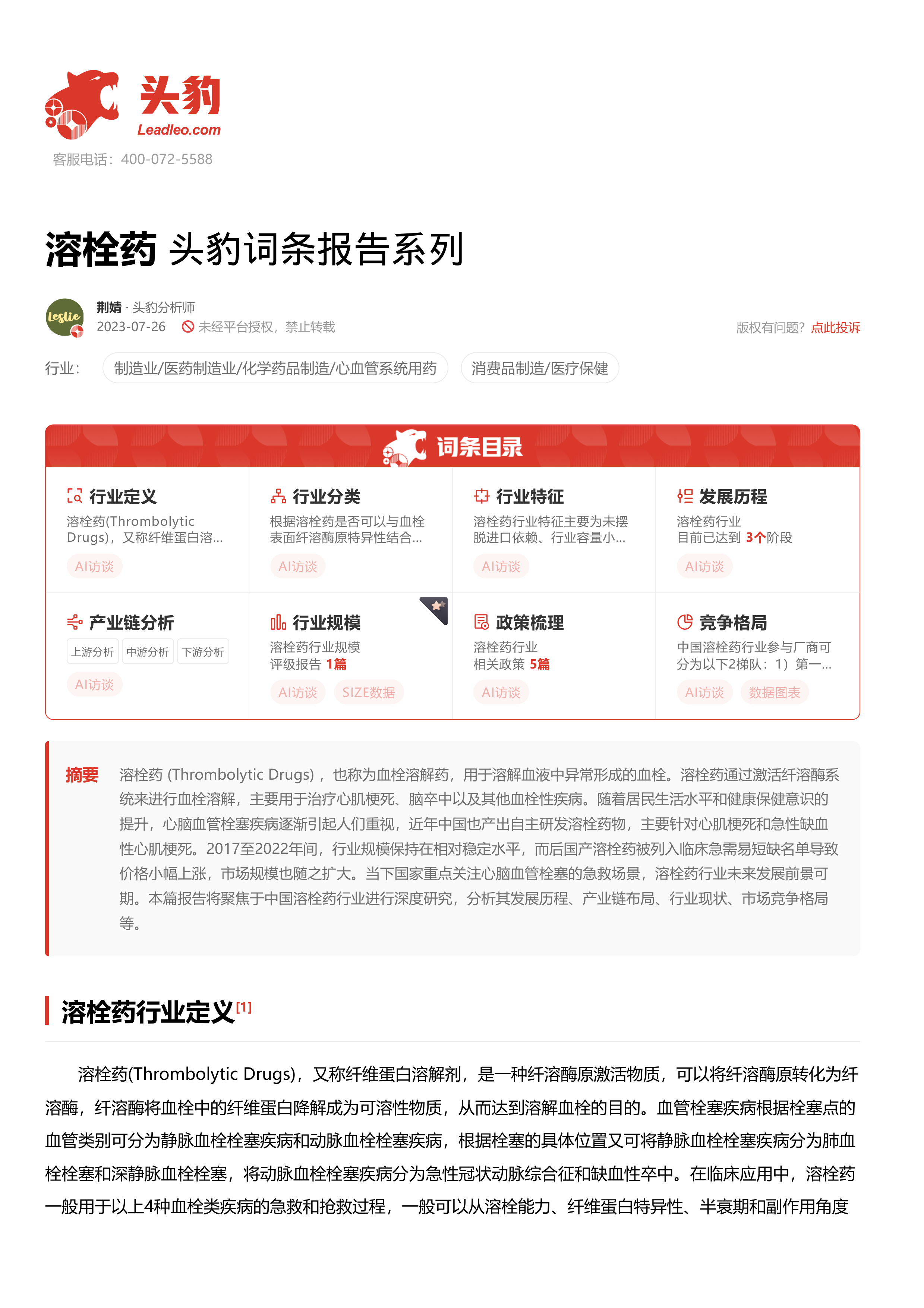 溶栓药 (Thrombolytic Drugs) ,也称为血栓溶解药,用于溶解血液中异常形成的血栓。溶栓药通过激活纤溶酶系统来进行血栓溶解,主要用于治疗心肌梗死、脑卒中以及其他血栓性疾病。随着居民生活水平和健康保健意识的提升,心脑血管栓塞疾病逐渐引起人们重视,近年中国也产出自主研发溶栓药物,主要针对心肌梗死和急性缺血性心肌梗死。2017至2022年间,行业规模保持在相对稳定水平,而后国产溶栓药被列入临床急需易短缺名单导致价格小幅上涨,市场规模也随之扩大。当下国家重点关注心脑血管栓塞的急救场景,溶栓药行业未来发展前景可期。本篇报告将聚焦于中国溶栓药行业进行深度研究,分析其发展历程、产业链布局、行业现状、市场竞争格局等。
