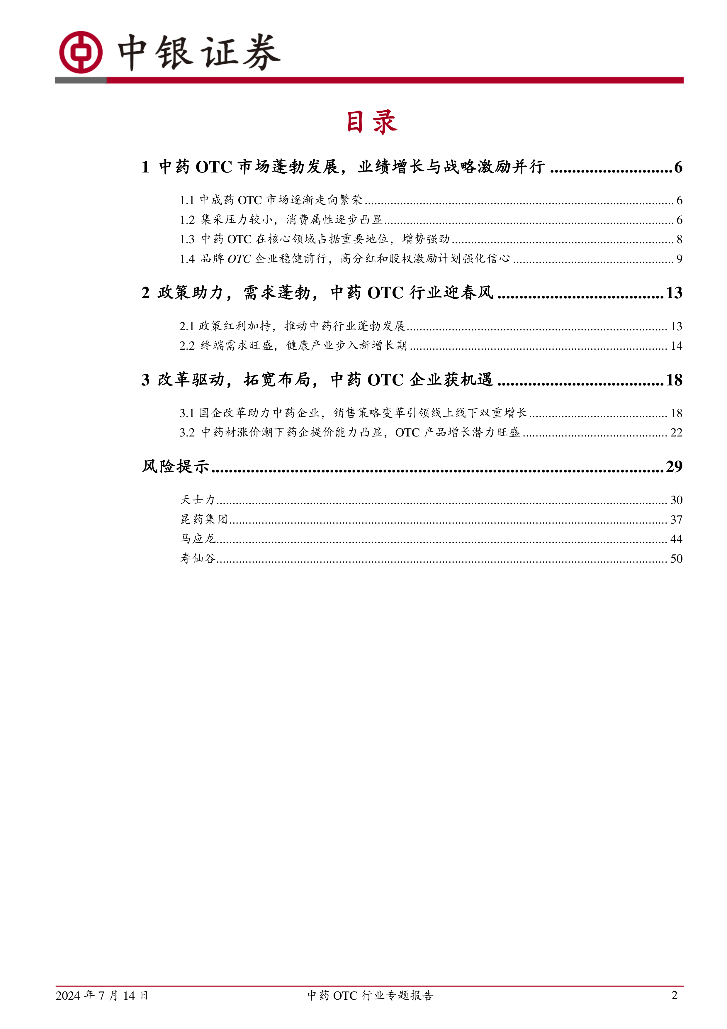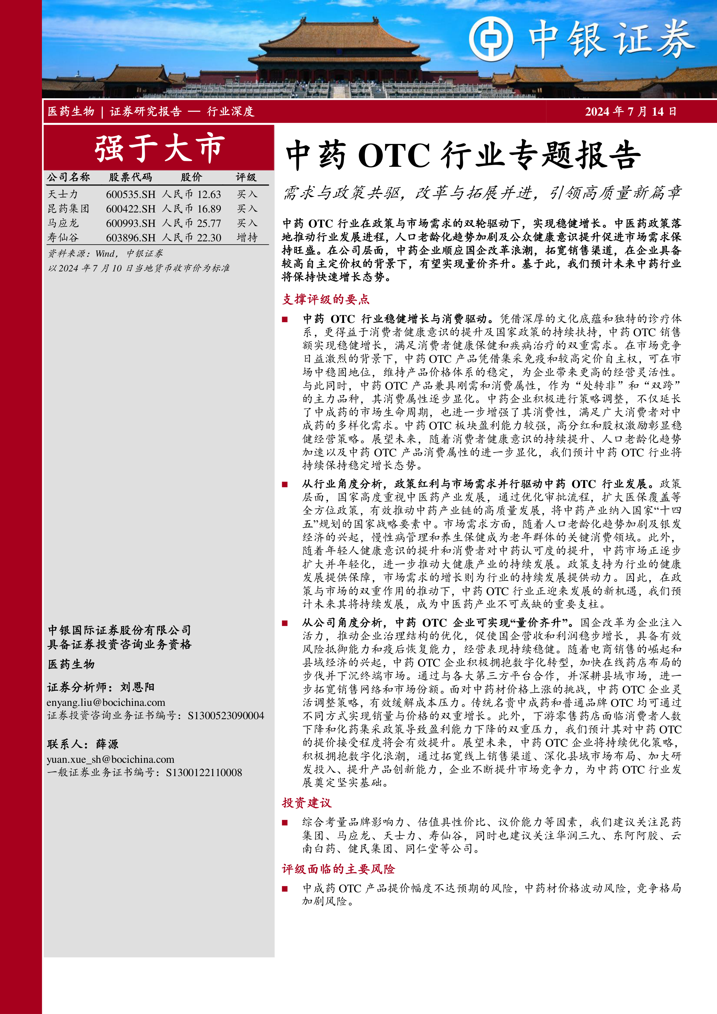 中药OTC行业在政策与市场需求的双轮驱动下,实现稳健增长。中医药政策落地推动行业发展进程,人口老龄化趋势加剧及公众健康意识提升促进市场需求保持旺盛。在公司层面,中药企业顺应国企改革浪潮,拓宽销售渠道,在企业具备较高自主定价权的背景下,有望实现量价齐升。基于此,我们预计未来中药行业将保持快速增长态势。