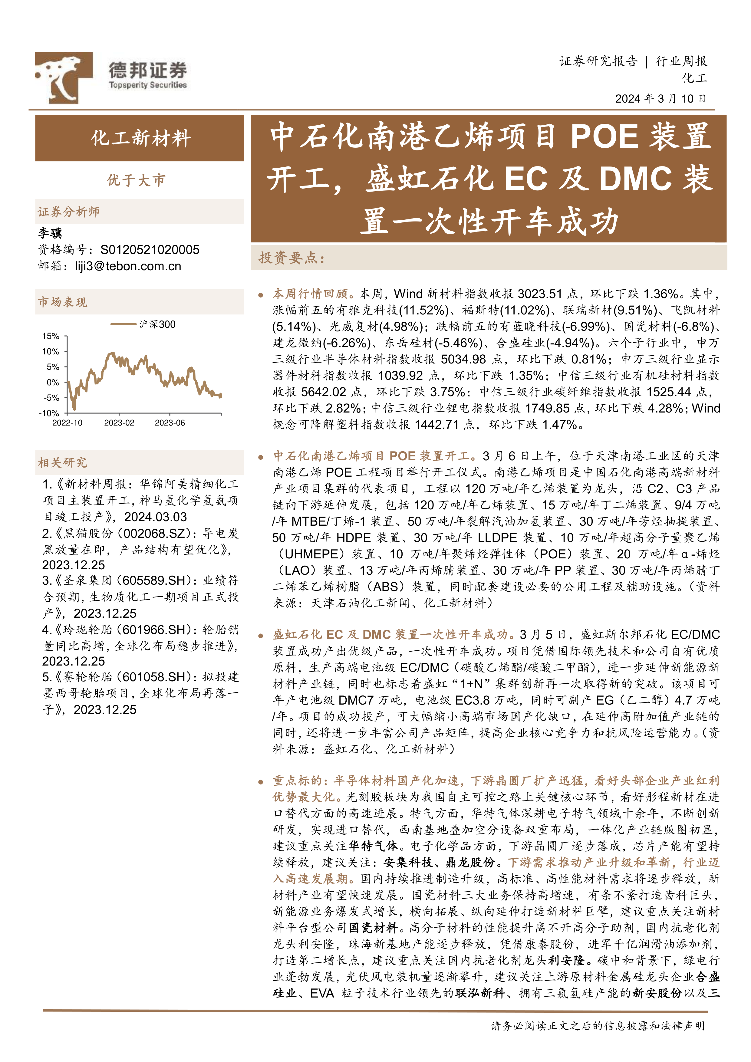 化工新材料行业周报:中石化南港乙烯项目POE装置开工,盛虹石化EC及DMC装置一次性开车成功