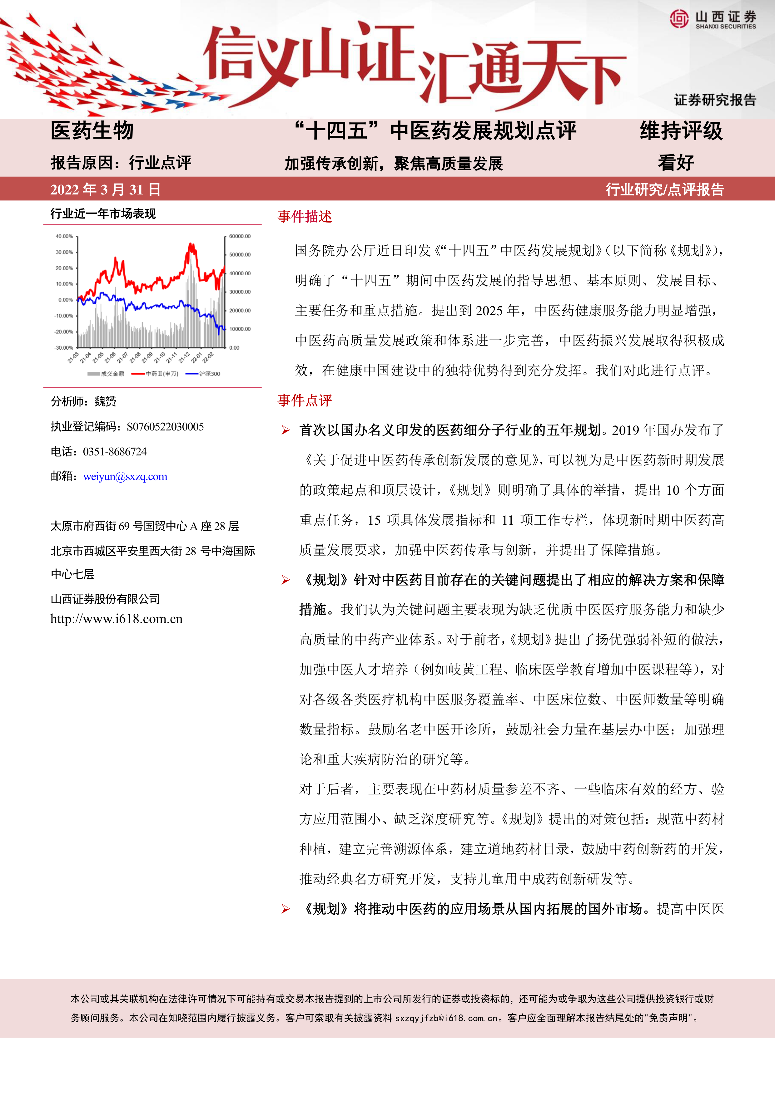 本报告的核心观点是:《“十四五”中医药发展规划》(以下简称《规划》)的发布,标志着国家对中医药高质量发展政策的进一步加码,为中医药行业长期发展打开了广阔空间。报告分析了《规划》中针对中医药发展现状提出的关键问题解决方案,并对未来中医药产业发展趋势及投资机会进行了展望。