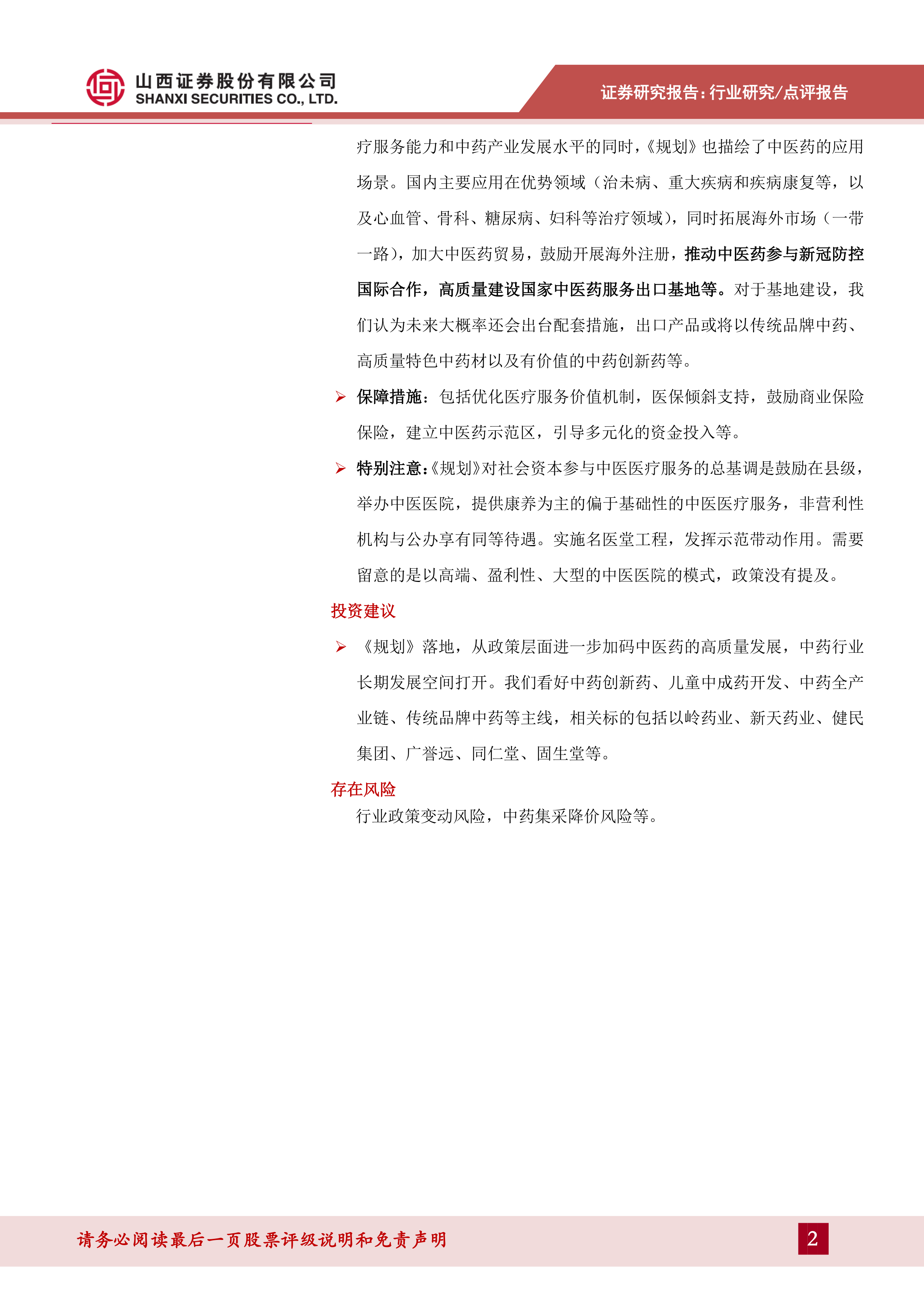 《规划》将推动中医药的应用场景从国内拓展的国外市场。提高中医医疗服务能力和中药产业发展水平的同时,《规划》也描绘了中医药的应用场景。国内主要应用在优势领域(治未病、重大疾病和疾病康复等,以及心血管、骨科、糖尿病、妇科等治疗领域),同时拓展海外市场(一带一路),加大中医药贸易,鼓励开展海外注册,推动中医药参与新冠防控国际合作,高质量建设国家中医药服务出口基地等。对于基地建设,我们认为未来大概率还会出台配套措施,出口产品或将以传统品牌中药、高质量特色中药材以及有价值的中药创新药等。