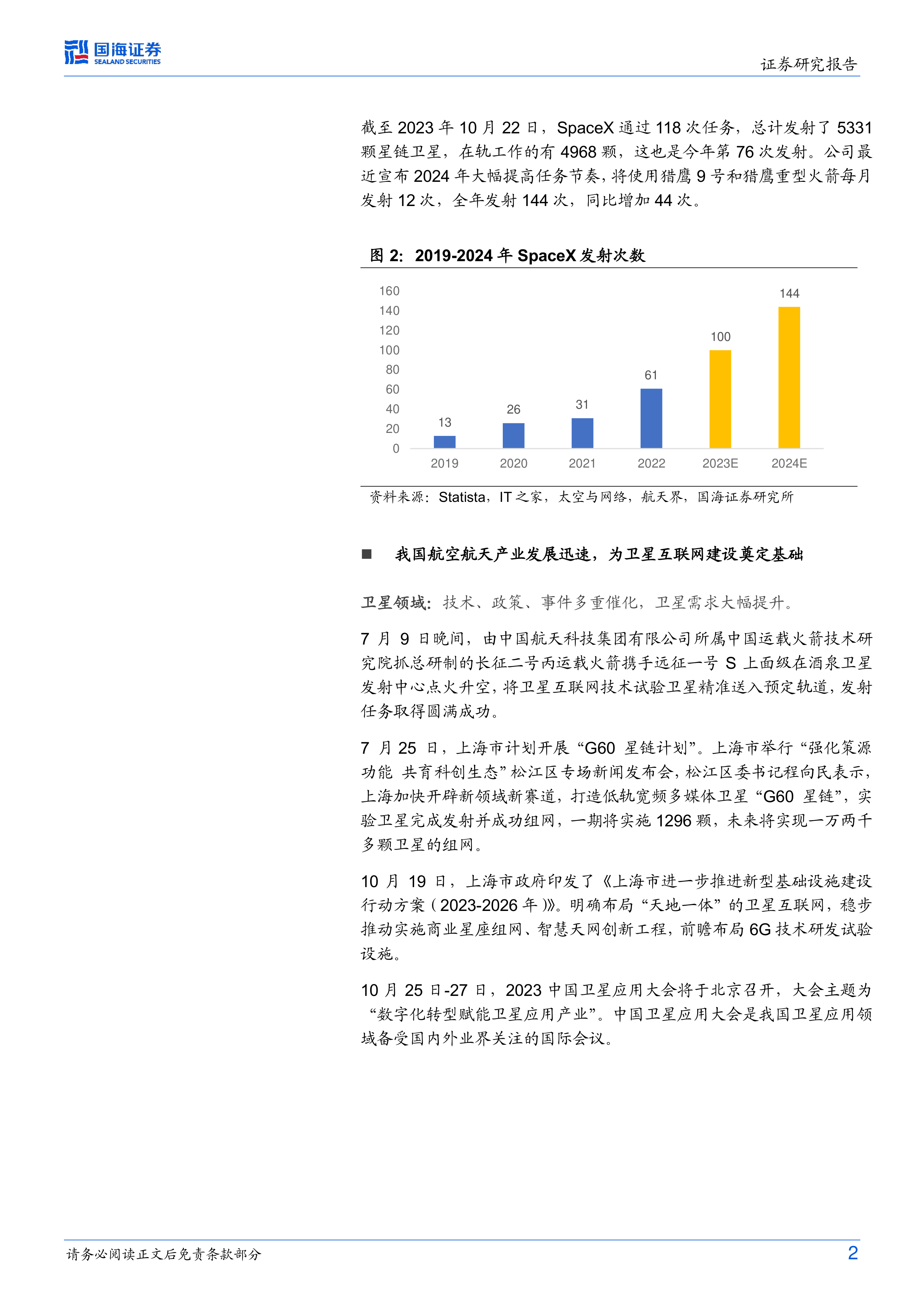SpaceX公司推出星链直连手机业务,并计划在2024年大幅提高卫星发射频率,这标志着卫星互联网建设进入加速阶段。截至2023年10月22日,SpaceX已发射超过5300颗星链卫星,在轨运行卫星近5000颗。预计2024年发射次数将达到144次,同比增长44%。 SpaceX的行动直接推动了全球卫星互联网的快速发展,也为航天新材料市场带来了巨大的需求。