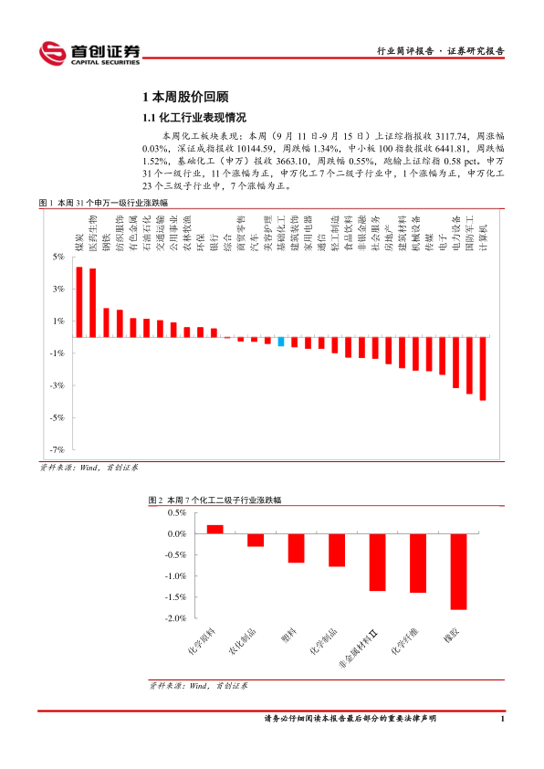 本周化工板块表现:本周(9月11日-9月15日)上证综指报收3117.74,周涨幅0.03%,深证成指报收10144.59,周跌幅1.34%,中小板100指数报收6441.81,周跌幅1.52%,基础化工(申万)报收3663.10,周跌幅0.55%,跑输上证综指0.58pct。申万31个一级行业,11个涨幅为正,申万化工7个二级子行业中,1个涨幅为正,申万化工23个三级子行业中,7个涨幅为正。本周化工行业407家上市公司中,有140家涨幅为正。涨幅居前的个股有*ST榕泰、七彩化学、禾昌聚合、中广核技、高盟新材、丹化科技、红宝丽、中核镇白、科创新源、争光股份等。