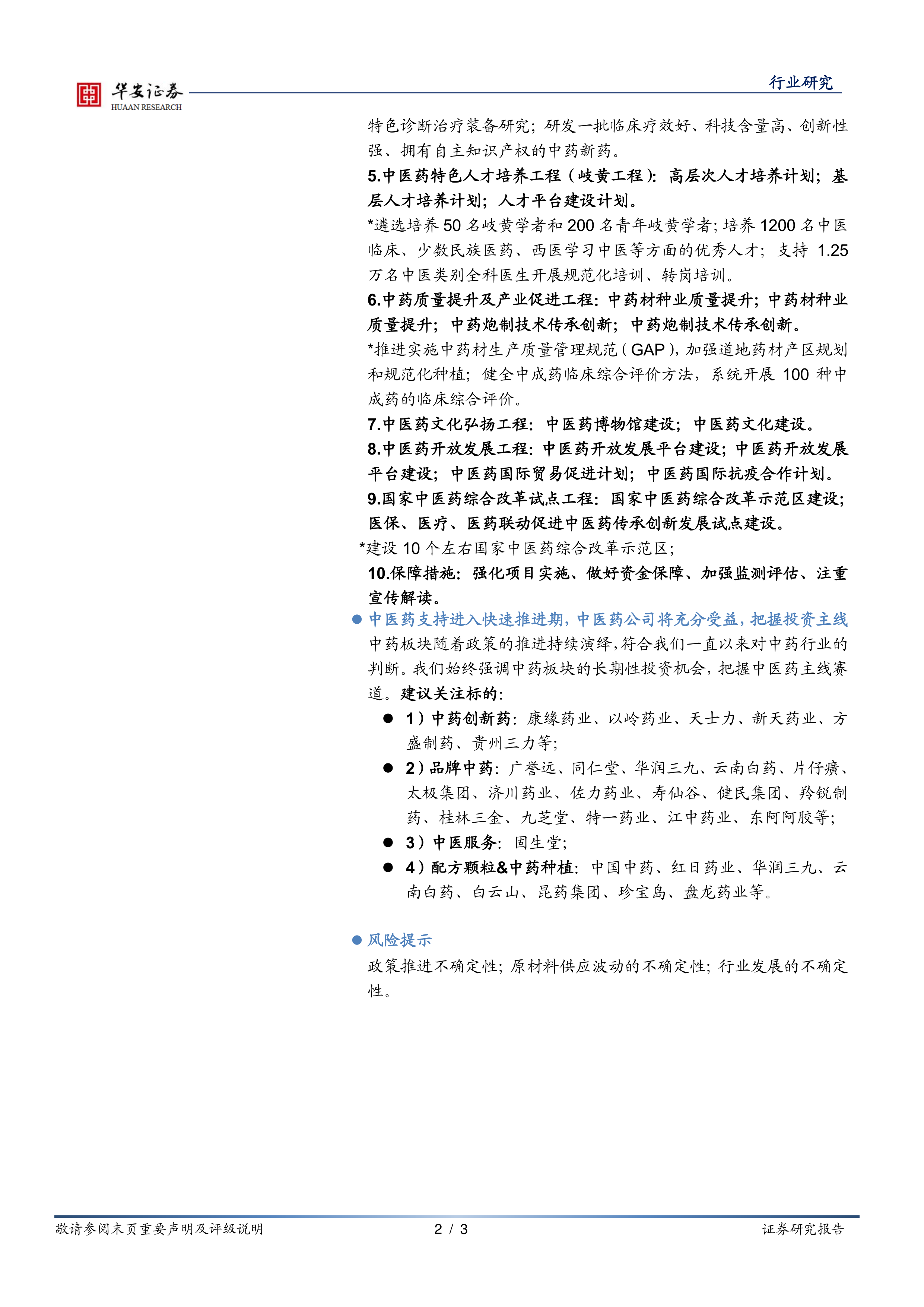 中医药支持进入快速推进期,中医药公司将充分受益,把握投资主线中药板块随着政策的推进持续演绎,符合我们一直以来对中药行业的判断。我们始终强调中药板块的长期性投资机会,把握中医药主线赛道。 建议关注标的: