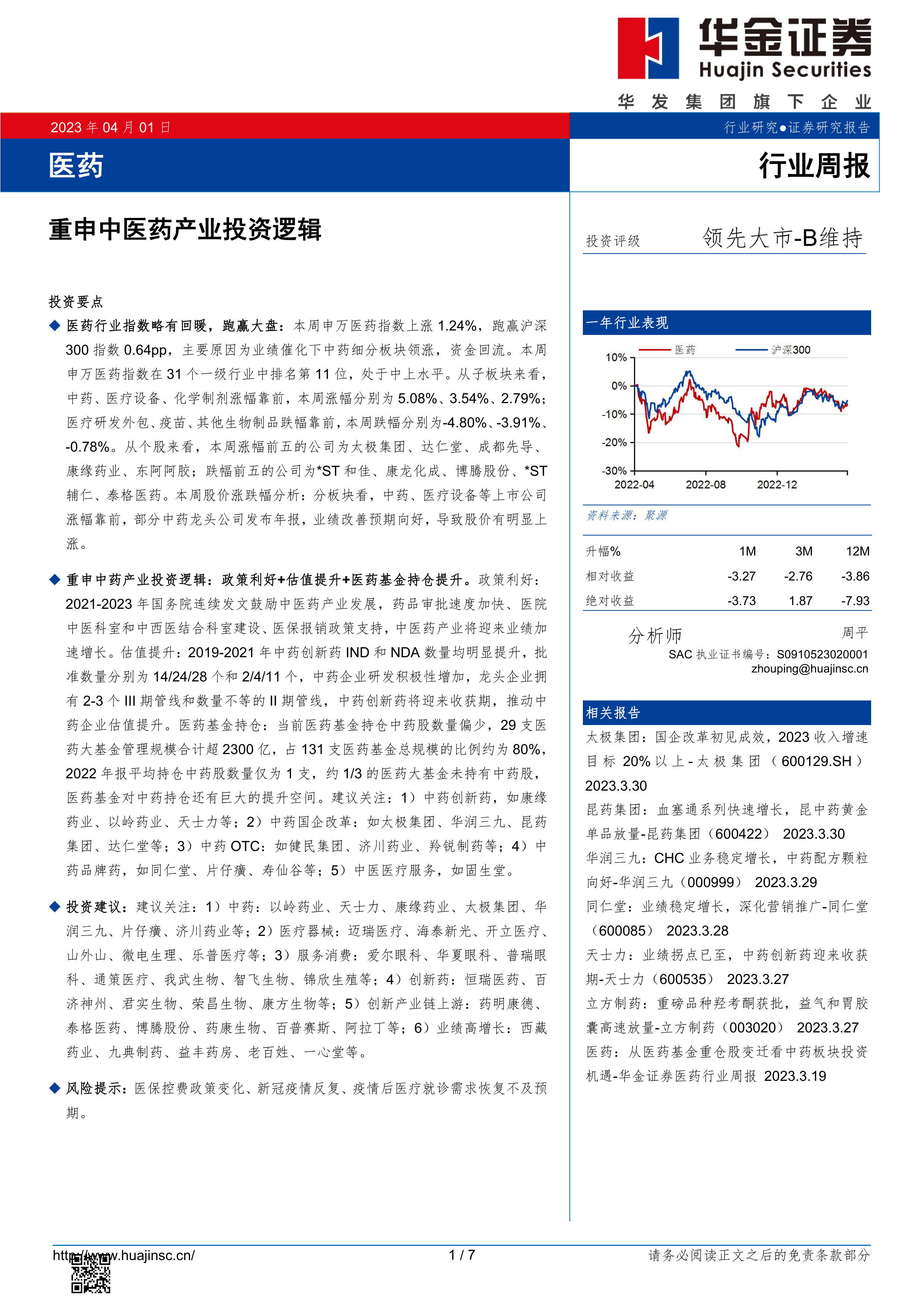 重申中药产业投资逻辑:政策利好+估值提升+医药基金持仓提升。政策利好:2021-2023年国务院连续发文鼓励中医药产业发展,药品审批速度加快、医院中医科室和中西医结合科室建设、医保报销政策支持,中医药产业将迎来业绩加速增长。估值提升:2019-2021年中药创新药IND和NDA数量均明显提升,批准数量分别为14/24/28个和2/4/11个,中药企业研发积极性增加,龙头企业拥有2-3个III期管线和数量不等的II期管线,中药创新药将迎来收获期,推动中药企业估值提升。医药基金持仓:当前医药基金持仓中药股数量偏少,29支医药大基金管理规模合计超2300亿,占131支医药基金总规模的比例约为80%,2022年报平均持仓中药股数量仅为1支,约1/3的医药大基金未持有中药股,医药基金对中药持仓还有巨大的提升空间。建议关注:1)中药创新药,如康缘药业、以岭药业、天士力等;2)中药国企改革:如太极集团、华润三九、昆药集团、达仁堂等;3)中药OTC:如健民集团、济川药业、羚锐制药等;4)中药品牌药,如同仁堂、片仔癀、寿仙谷等;5)中医医疗服务,如固生堂。