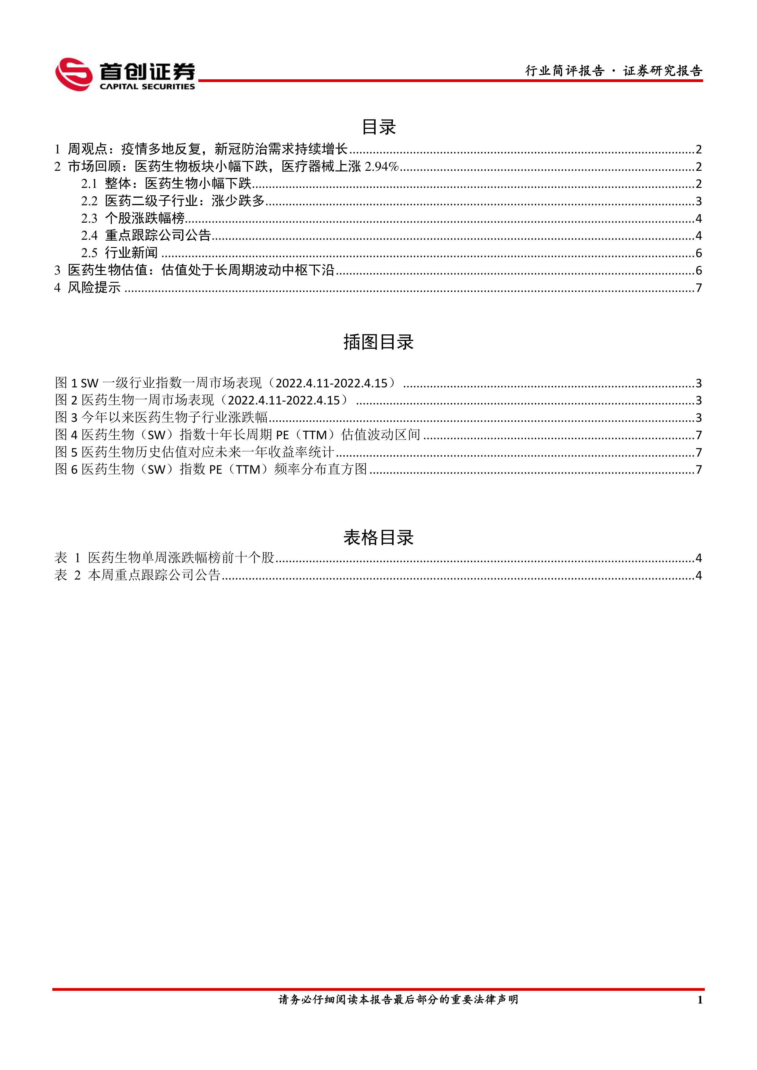 本报告基于全国多地疫情反复的现状,分析了新冠防治需求持续增长对医药行业的影响,并建议投资者关注相关细分领域的投资机会。报告同时对上周医药生物板块的市场表现、重点公司公告、行业新闻以及估值情况进行了详细分析,为投资者提供参考。 然而,报告也提示了医药政策风险、降价超预期以及系统性风险等潜在风险,投资者需谨慎决策。 报告数据主要来源于Wind和聚源数据,并对数据来源进行了明确标注。