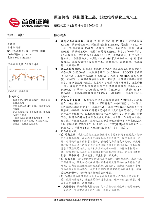 本报告的核心观点是:原油价格下跌拖累化工品整体表现,基础化工板块本周跑输上证综指3.15pct。但部分化工产品价格上涨,价差也出现分化,磷化工和氟化工板块值得关注。报告建议关注化工龙头企业,以及受益于新能源和房地产政策利好的相关公司。