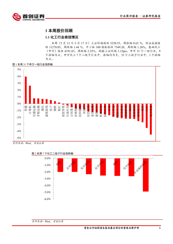 本周化工板块表现: 本周(3 月 13 日-3 月 17 日)上证综指报收3250.55,周涨幅 0.63 %,深证成指报收 11278.05,周跌幅 1.44 %,中小板 100 指数报收 7349.20,周跌幅 1.26%,基础化工(申万)报收4191.83,周跌幅 2.52%,跑输上证综指 3.15pct。申万 31 个一级行业,9个涨幅为正,申万化工 7个二级子行业中,涨幅均为负,33个三级子行业中,1 个涨幅为正。本周化工行业 386 家上市公司中,有 57 家涨幅为正。涨幅居前的个股有金力泰、联科科技、滨化股份、飞鹿股份、久日新材等。