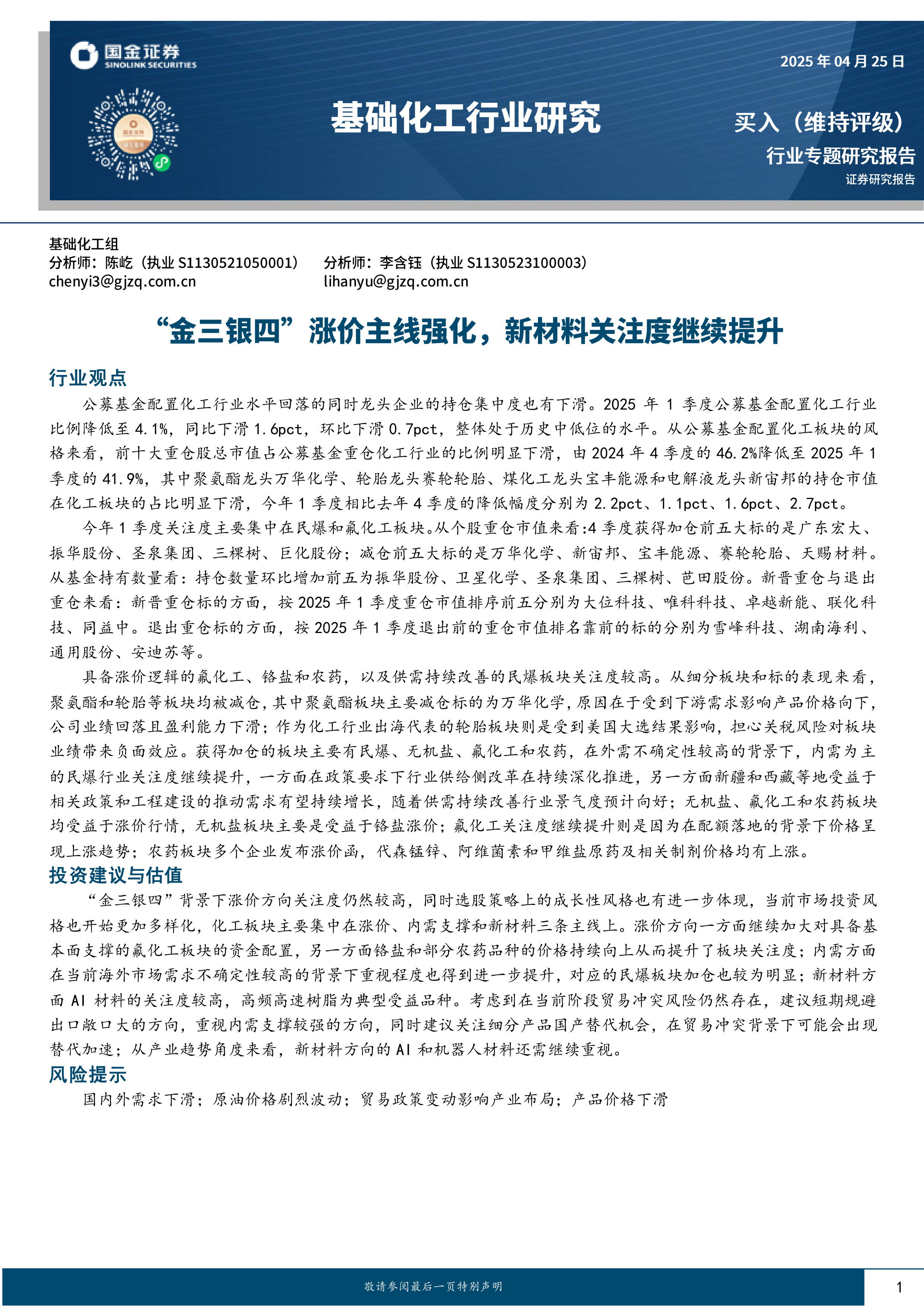 本报告基于公募基金2025年第一季度对化工行业的配置数据,分析了化工行业投资现状及未来趋势。核心观点如下: