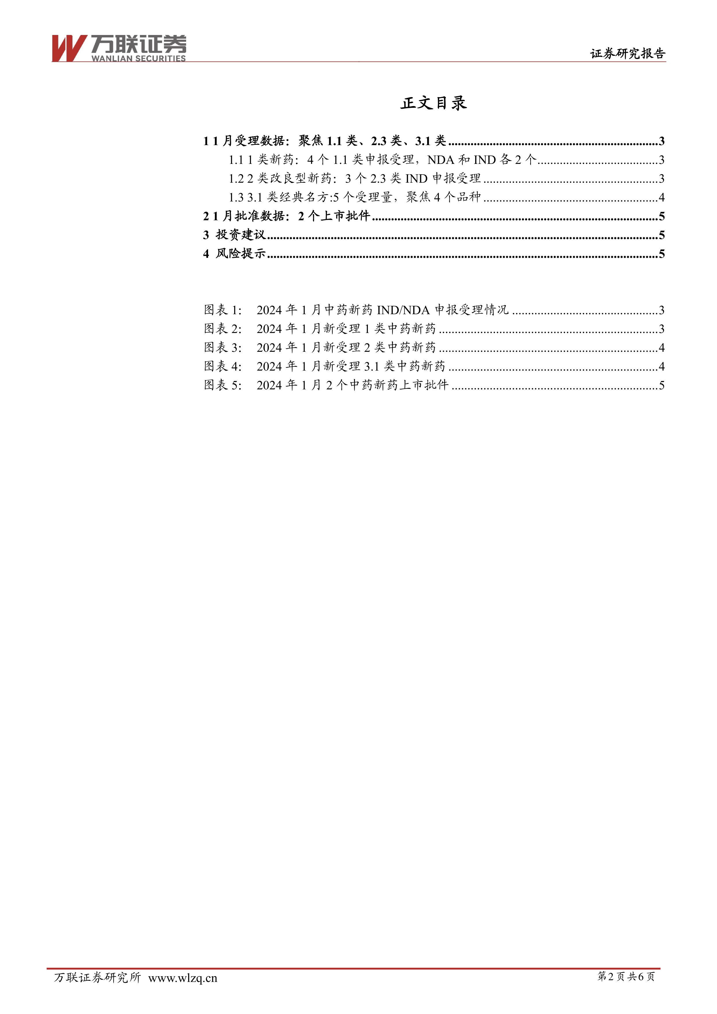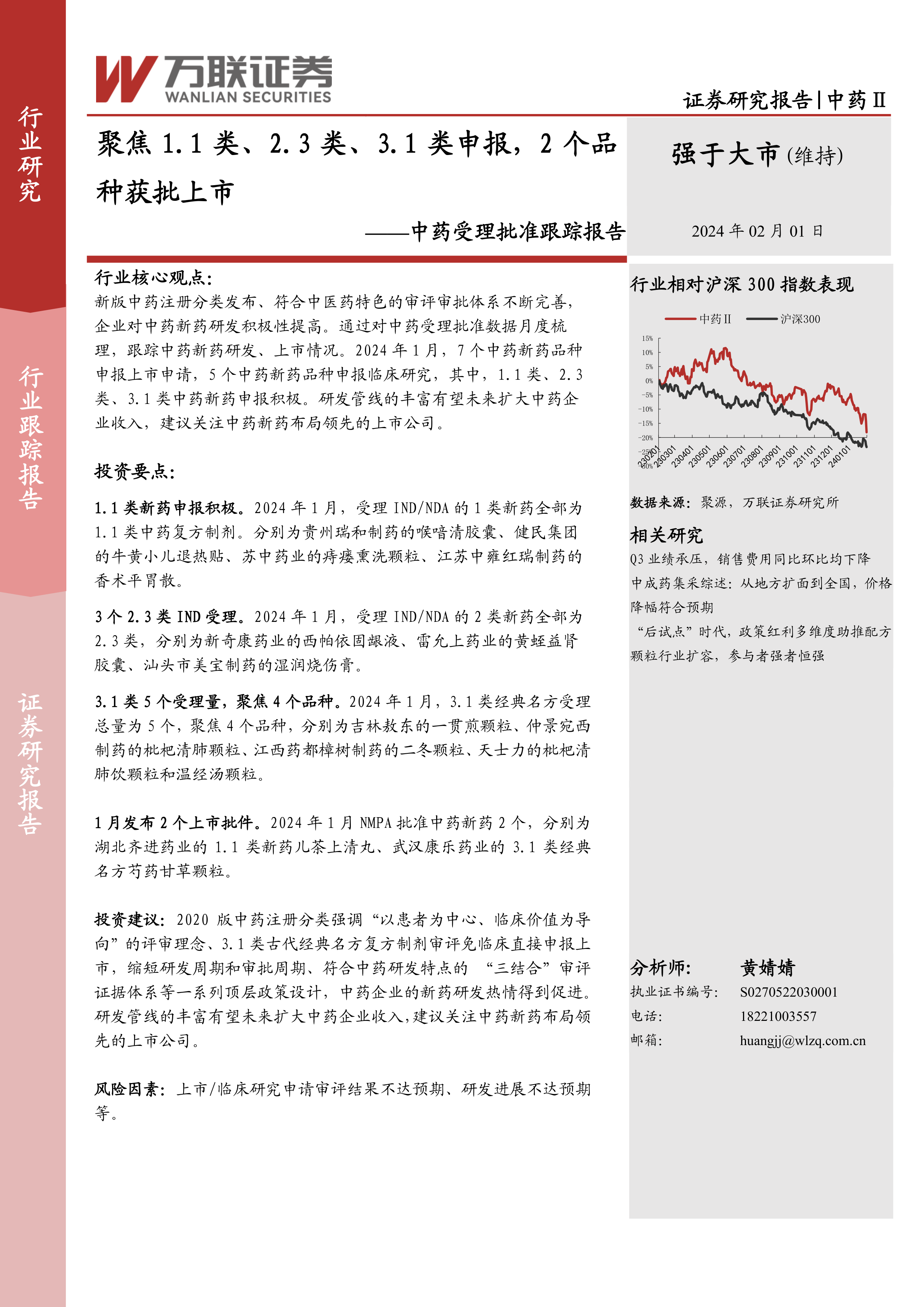 本报告的核心观点是:2024年1月,中国中药新药研发申报呈现积极态势,尤其在1.1类、2.3类和3.1类中药新药方面表现突出。新版中药注册分类的发布以及审评审批体系的完善,促进了中药企业研发积极性。 研发管线的丰富有望提升中药企业未来收入,建议关注中药新药布局领先的上市公司。