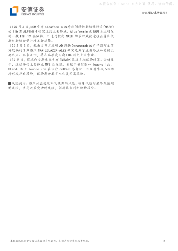 本部分重点关注了本周海外新药行业的一些重要事件,例如 NGM 的 aldafermin 治疗 NASH 的 IIb 期临床试验达到主要终点、礼来的 Donanemab 治疗早期阿尔茨海默病的 III 期临床试验达到主要终点、辉瑞/安斯泰来 的 Xtandi 临床试验结果等。 报告对这些事件进行了简要描述,并对其中一些事件进行了更深入的分析,例如对 aldafermin 的作用机制和市场前景进行了简要介绍。 此外,报告还关注了其他一些海外新药企业的动态,例如 IDEAYA、MORPHIC、Stablix/Vertex、Bridge、Akebia、UCB 和 GSK 等。