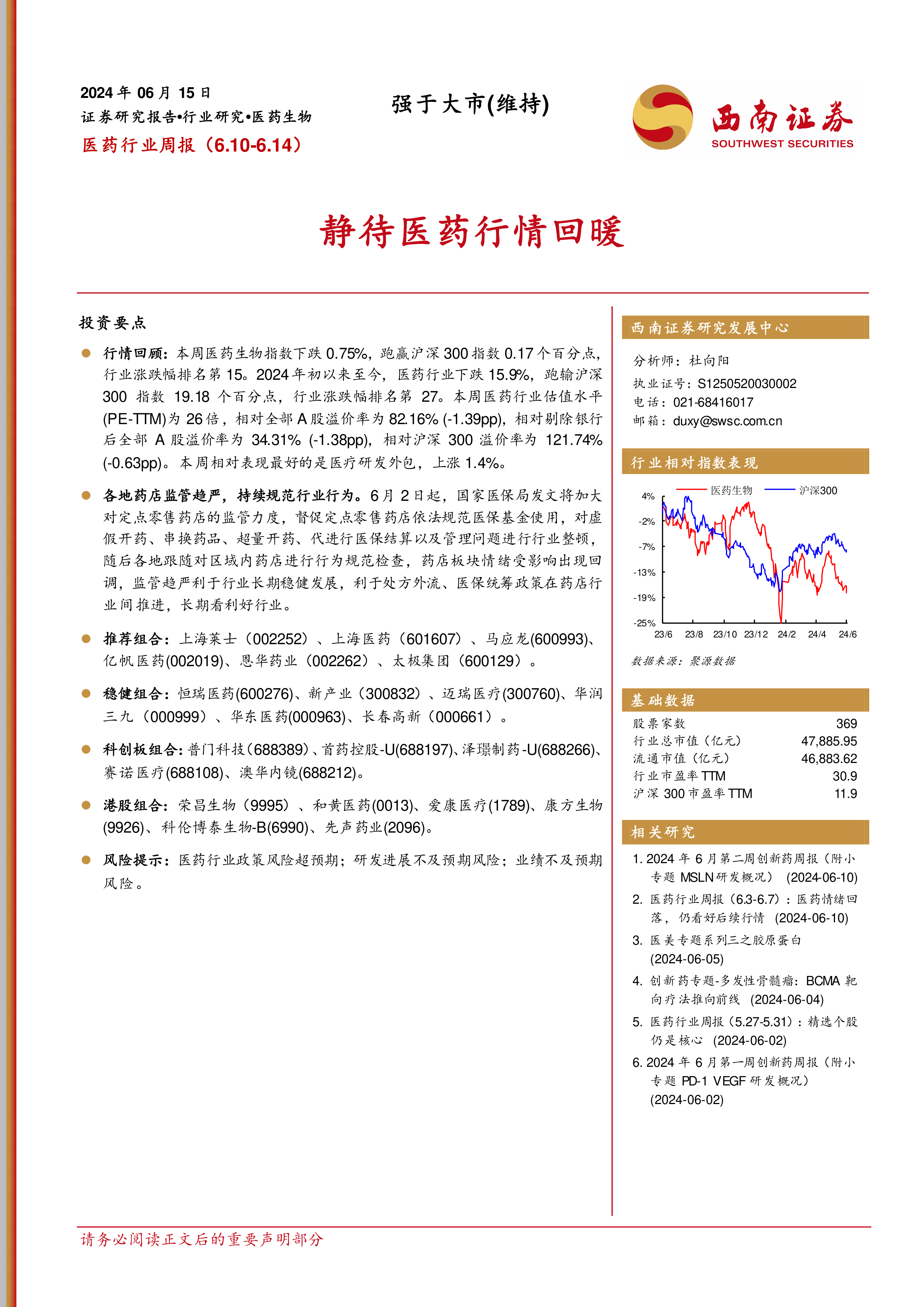 报告首先回顾了本周医药行业行情,并基于政策、估值、基本面三个维度,重申了2024年年度投资策略:在海外宏观降息预期下,医药板块仍有结构性机会。 策略重点关注:1)创新+出海;2)医疗反腐后院内医疗刚性需求;3)低估值+业绩反转个股;4)减肥药和AI医疗主题投资机会。 报告分别推荐了推荐组合、稳健组合、科创板组合和港股组合,并提供了各组合公司盈利预测数据(表1)。 随后,报告分别对上周推荐组合(表2)、稳健组合(表3)、科创板组合(表4)和港股组合(表5)的表现进行了分析,并对各组合中个股的近期表现和未来预期进行了简要说明。