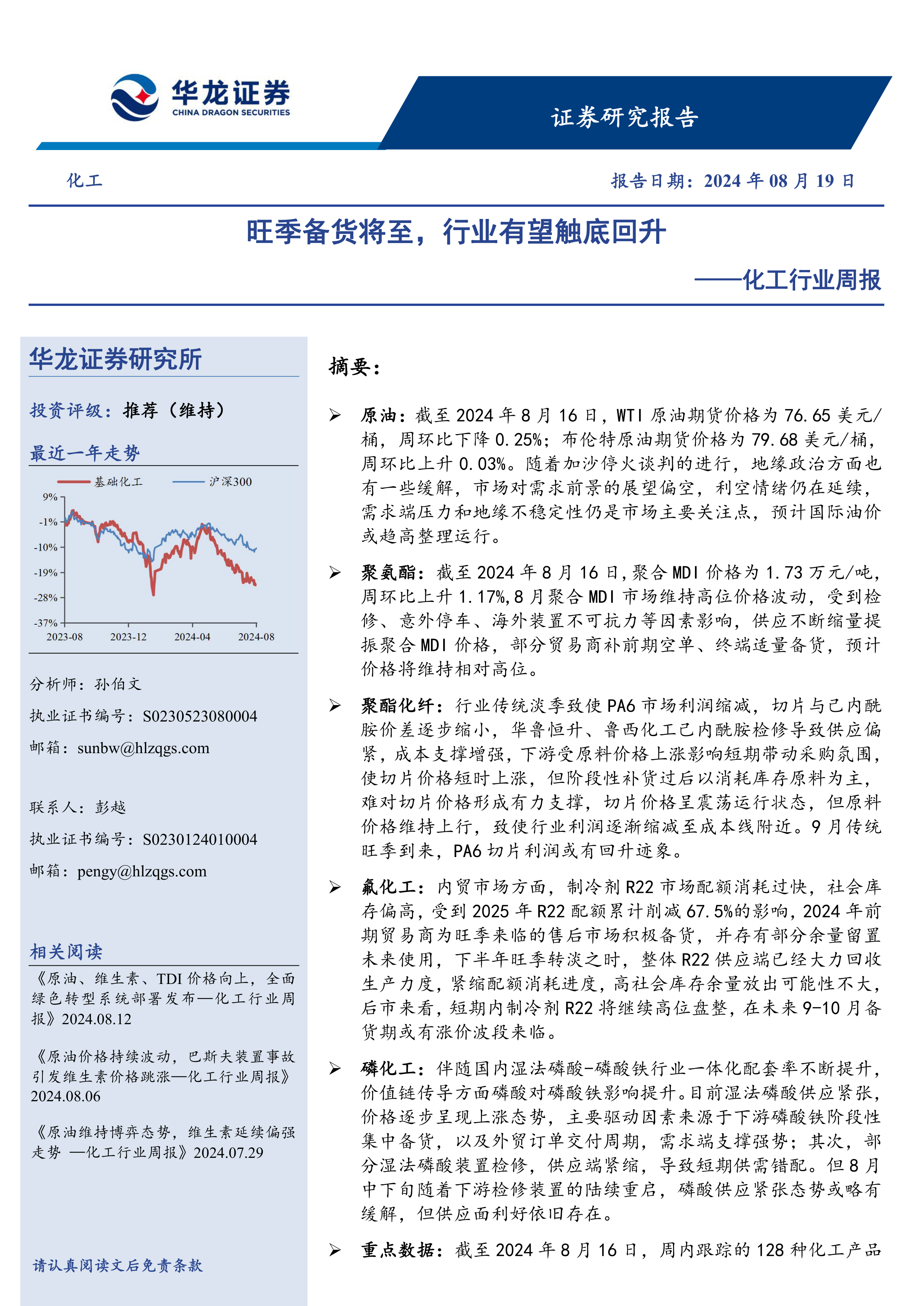 本报告通过对2024年8月12日至16日期间化工行业市场表现、关键产品价格及供需数据、行业要闻和重点公司公告的综合分析,得出化工行业在传统淡季后有望触底回升的结论。 报告详细分析了多个细分领域的市场动态,并提出了相应的投资建议,为投资者提供了有价值的参考信息。 然而,报告也明确指出了原油价格波动、汇率波动等潜在风险,投资者需谨慎决策。 9月旺季的到来将是验证这一结论的关键时期,后续市场表现值得持续关注。