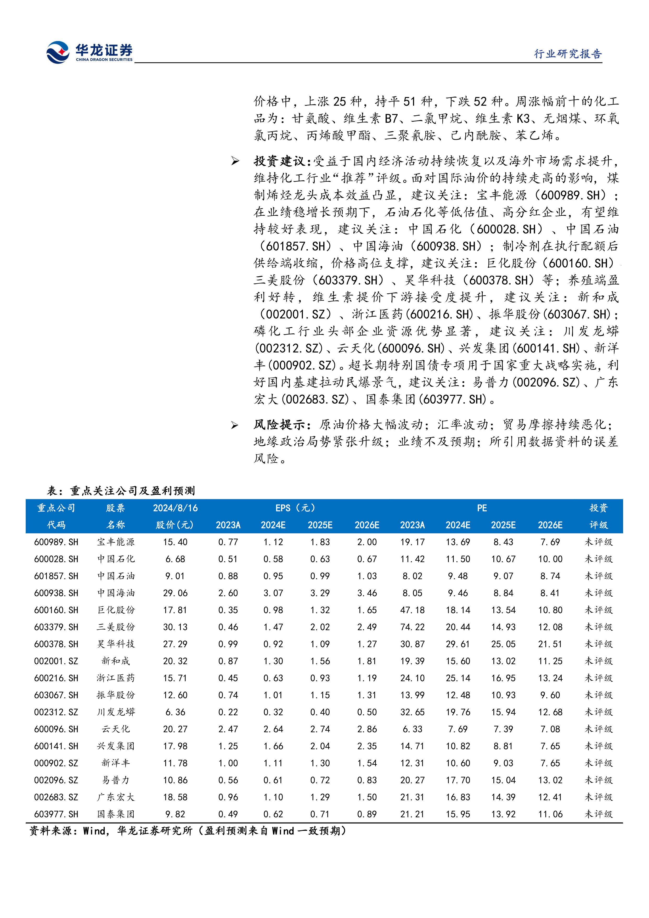 投资建议:受益于国内经济活动持续恢复以及海外市场需求提升,维持化工行业“推荐”评级。面对国际油价的持续走高的影响,煤制烯烃龙头成本效益凸显,建议关注:宝丰能源(600989.SH);在业绩稳增长预期下,石油石化等低估值、高分红企业,有望维持较好表现,建议关注:中国石化(600028.SH)、中国石油(601857.SH)、中国海油(600938.SH);制冷剂在执行配额后供给端收缩,价格高位支撑,建议关注:巨化股份(600160.SH)三美股份(603379.SH)、昊华科技(600378.SH)等;养殖端盈利好转,维生素提价下游接受度提升,建议关注:新和成(002001.SZ)、浙江医药(600216.SH)、振华股份(603067.SH);磷化工行业头部企业资源优势显著,建议关注:川发龙蟒(002312.SZ)、云天化(600096.SH)、兴发集团(600141.SH)、新洋丰(000902.SZ)。超长期特别国债专项用于国家重大战略实施,利好国内基建拉动民爆景气,建议关注:易普力(002096.SZ)、广东宏大(002683.SZ)、国泰集团(603977.SH)。