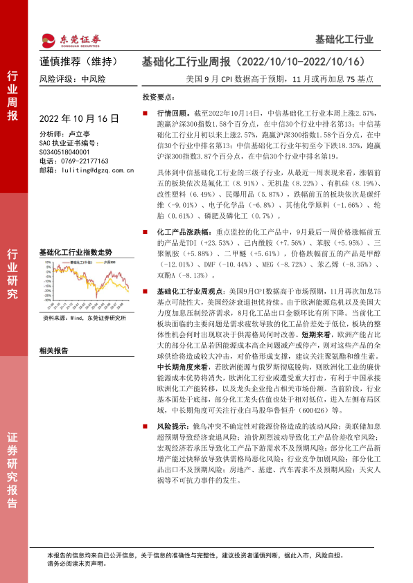 本报告的核心观点是:尽管美国9月CPI数据高于预期,加剧了市场对经济衰退的担忧,并可能导致美联储进一步加息,但短期内欧洲能源危机导致部分化工产品减产,将对全球供给造成冲击,从而支撑价格。建议关注聚氨酯(TDI)和维生素等受此影响的板块。中长期来看,欧洲能源与俄罗斯彻底脱钩将重创欧洲化工产业,为中国化工企业带来承接产能转移和抢占市场份额的机会,建议关注行业龙头企业。当前基础化工行业基本面处于底部,部分龙头企业估值较低,具备左侧布局价值。