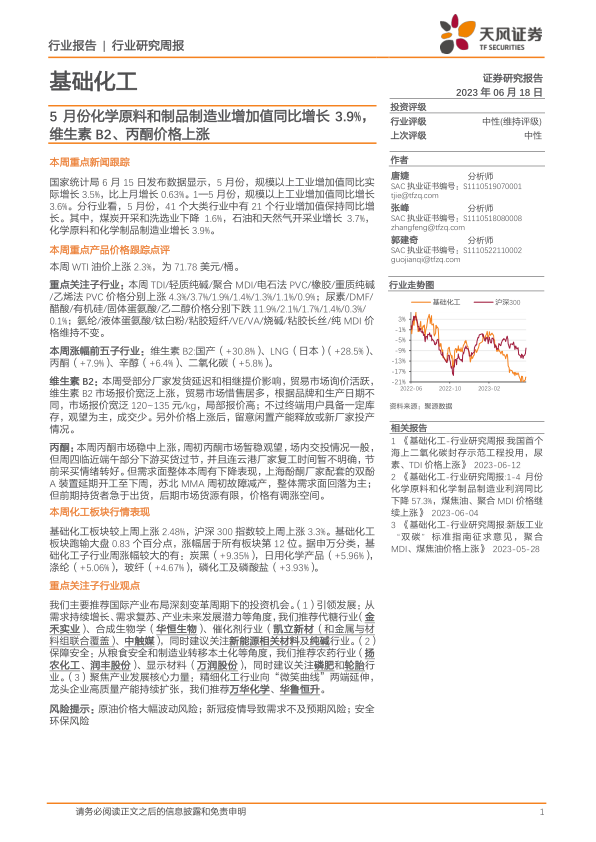 本报告的核心观点是:5月份基础化工行业整体表现稳健,化学原料和化学制品制造业增加值同比增长3.9%,跑输大盘0.83个百分点。部分化工产品价格出现波动,维生素B2和丙酮价格上涨显著,而尿素和DMF价格下跌明显。 投资建议方面,报告推荐关注国际产业布局变革下的投资机会,具体包括引领发展型行业(代糖、合成生物学、催化剂等)、保障安全型行业(农药、显示材料、磷肥等)以及产业发展核心力量(万华化学、华鲁恒升等)。 报告同时提示了原油价格波动、疫情影响以及安全环保等风险。