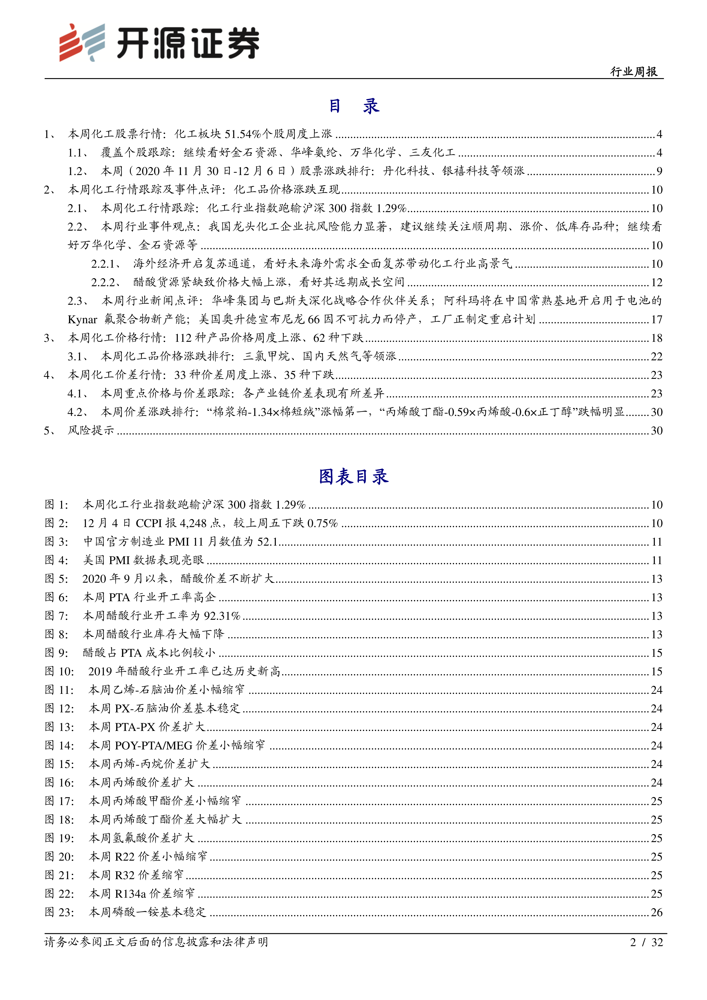 本周行业观点:醋酸货源紧缺致价格大幅上涨,看好醋酸2021年高景气全球经济开始不断复苏,中国财新PMI创十年新高,印证“海外订单内流”逻辑。根据国家统计局数据,中国官方制造业PMI11月数值为52.1。根据财新网数据,中国11月财新制造业PMI数值为54.9,就业指数录得2011年6月以来最高,需求改善带动企业采购活动的扩张率也创下2011年1月后最高纪录。此外,海外经济亦开始复苏。据IHSMarkit数据,美国11月制造业PMI数值上升至58.6,为历史高点。欧洲方面,据IHSMarkit数据,德国11月制造业PMI数值为57.8,英国11月制造业PMI数值为55.6,创35个月以来的新高。自5月以来,中国经济不断复苏,经济运行此前已进入常态化阶段。随着海外经济不断复苏,此次国内官方PMI数据创下2020年内高点,财新PMI方面,需求改善带动企业采购活动的扩张率也创下2011年1月后最高纪录,我们认为这是“海外订单”加速内流逻辑的印证,中国正在加速承接全球制造业订单,化工行业作为最重要的基础制造业之一,也将继续迎来新一轮景气行情。随着海外需求逐渐复苏,我们建议继续关注顺周期、涨价、低库存品种:钛白粉、PVC、粘胶、氨纶、涤纶长丝等,布局顺周期化工子行业龙头。受益标的:【化工龙头白马】万华化学、华鲁恒升、恒力石化、扬农化工、华峰氨纶、新和成、荣盛石化;【绝对低估值龙头】金石资源、三友化工、海利得、巨化股份、三美股份、利民股份、滨化股份;【弹性标的】江苏索普、华谊集团、鲁西化工、新凤鸣。本周(2020年11月30日-12月6日)醋酸价格大幅上涨。根据Wind数据,截至2020年12月4日,醋酸现货价为3,780元/吨,而2020年内低点为2,030元/吨,醋酸较年内低点累计涨幅已达67.49%。供应端,根据Wind数据,本周醋酸行业整体开工率为92.31%。库存方面,根据百川盈孚,截至12月5日,醋酸行业库存为61,500吨,较上周大幅下降9.56%。目前各醋酸厂家库存低位,下游拿货困难,醋酸行业及下游PTA开工率高企,我们预计下周醋酸将进一步上涨。未来醋酸或仍将处于供需紧平衡状态,看好醋酸未来长期价值。根据卓创资讯,2021年醋酸行业有效总产能将达到1,010万吨。若未来醋酸行业开工率能达到90%,对应年产量将为909万吨。2019年醋酸的表观消费量为695.28万吨,未来4,210万吨PTA将催生168.4万吨醋酸需求。仅考虑PTA带来的醋酸需求增量,以2019年醋酸表观消费量作为基数,未来国内醋酸的表观消费量保守估计或将达到863.68万吨。而2017年-2019年,醋酸年平均出口量为60.17万吨,届时醋酸行业或将处于供不应求的格局。我们坚定看好2021年醋酸行业持续景气。受益标的:华鲁恒升、江苏索普、华谊集团。