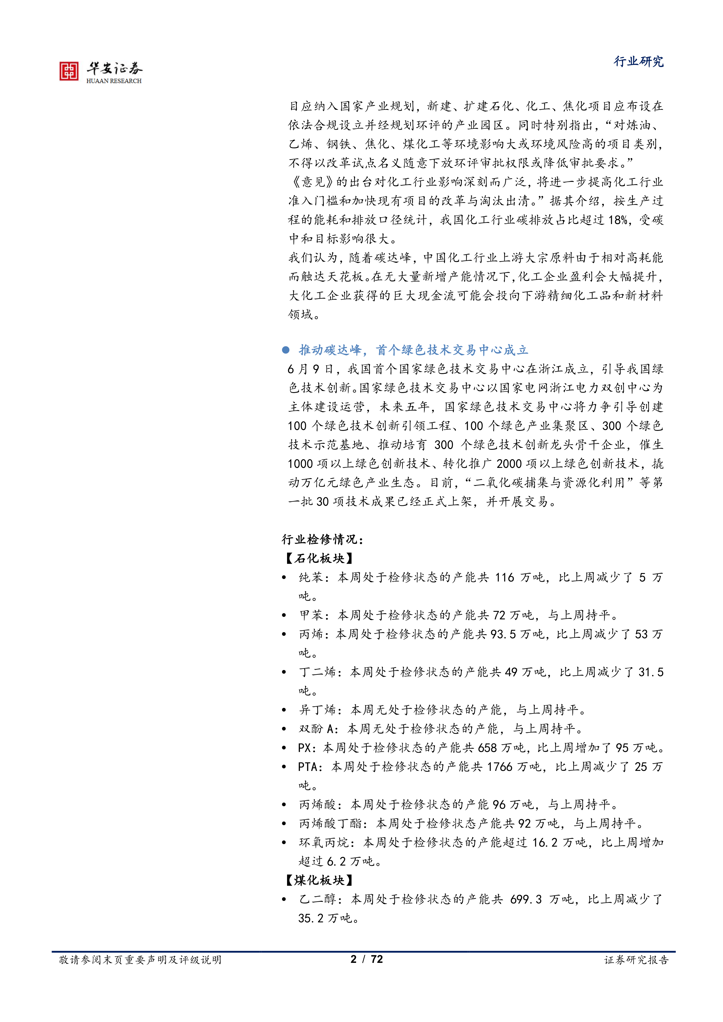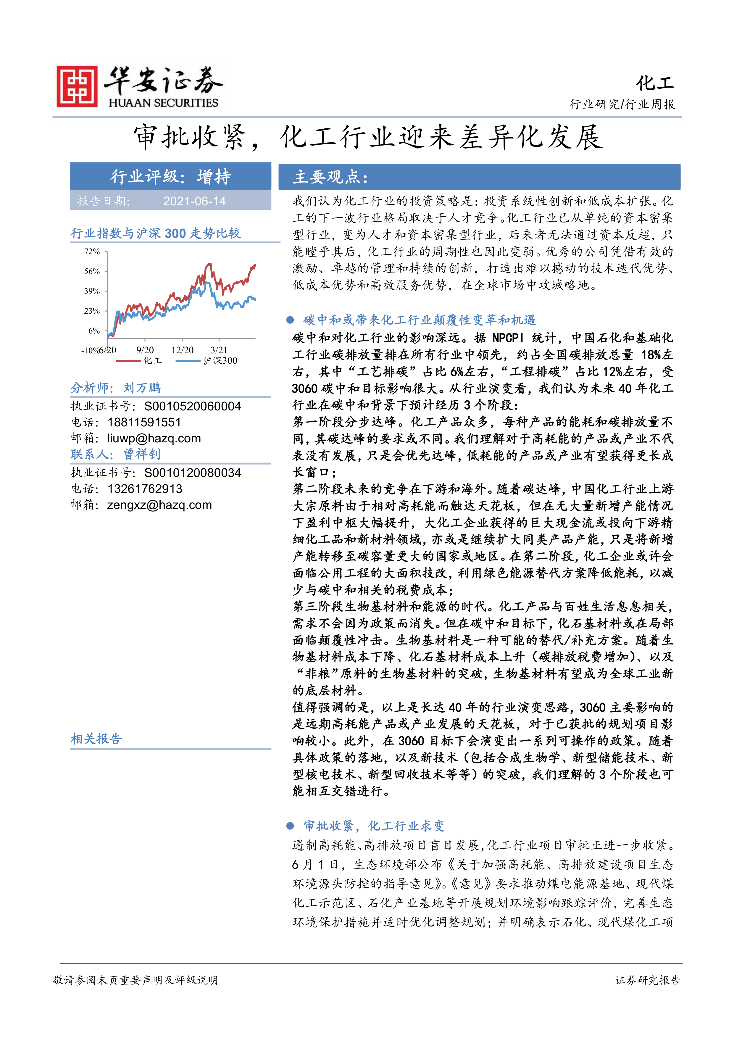 本报告通过对重点公司、行业供给侧、价格以及新股的分析,全面解读了化工行业在审批收紧和碳中和目标下的发展现状和未来趋势。 碳中和目标将深刻改变化工行业的竞争格局,推动行业向低碳、绿色、可持续方向发展。 投资者应关注具备系统性创新能力和低成本扩张能力的企业,并密切关注相关政策变化和技术突破。 同时,需充分认识到化工行业面临的各种风险,谨慎投资。