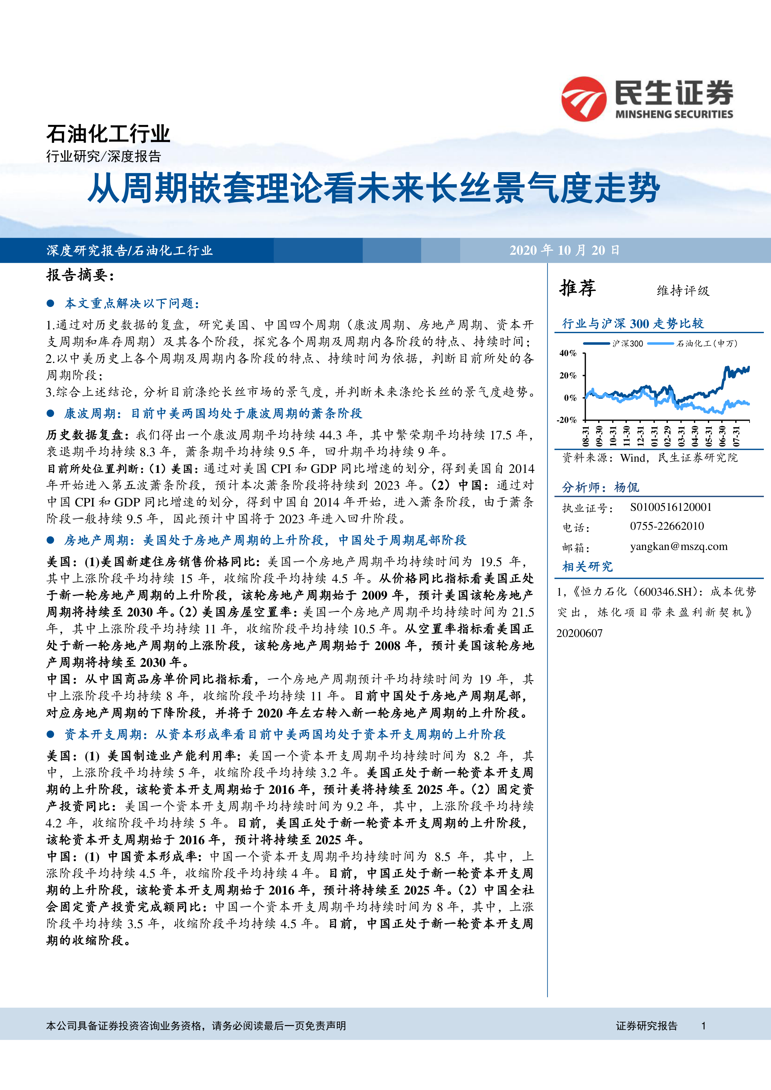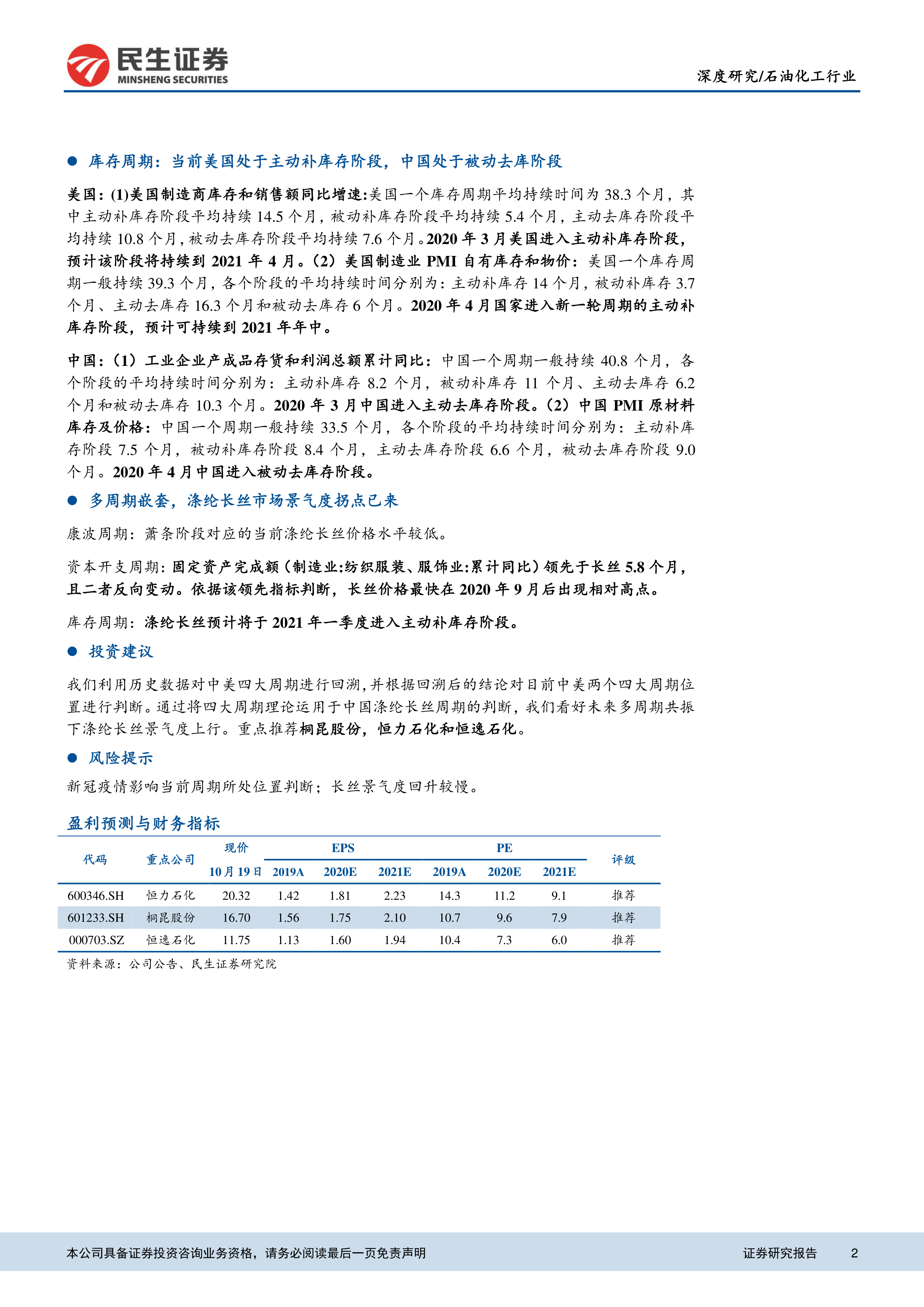 本报告通过对美国和中国四个主要经济周期(康波周期、房地产周期、资本开支周期和库存周期)的历史数据进行深入分析,并结合多周期嵌套理论,对涤纶长丝市场的未来景气度走势进行了预测。报告认为,尽管目前处于康波周期的萧条阶段,但资本开支周期和库存周期的上行趋势将推动涤纶长丝市场景气度在2021年第一季度出现拐点。报告同时指出了新冠疫情和下游行业景气度等可能影响预测结果的风险因素,并建议投资者重点关注桐昆股份、恒力石化和恒逸石化三家公司。 报告的分析方法严谨,数据翔实,结论具有较强的参考价值,但投资者仍需结合自身情况进行独立判断。