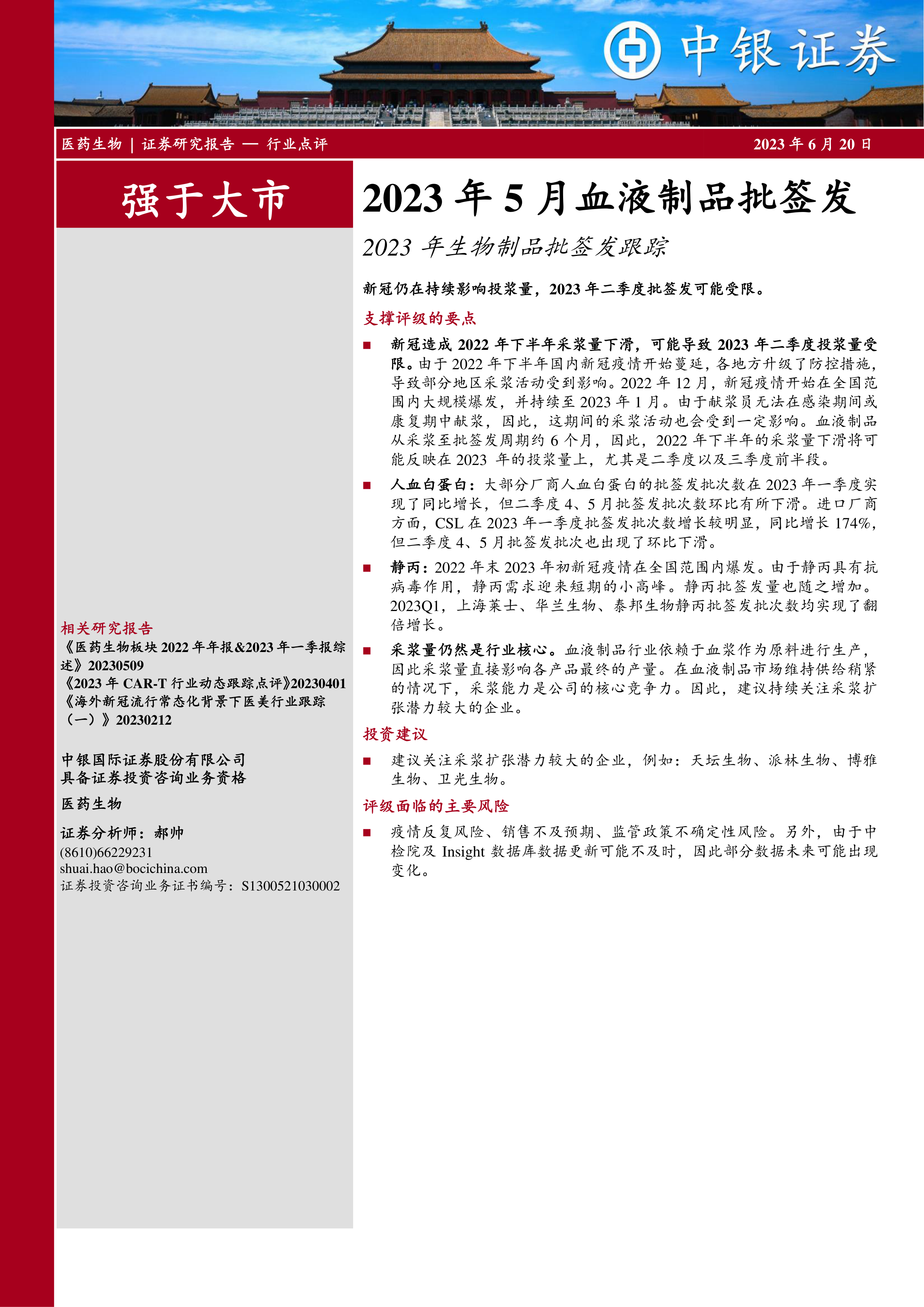 本报告主要基于中检院及Insight数据库的数据,对2023年5月血液制品批签发情况进行分析,并结合2022年下半年以来的新冠疫情影响进行解读。报告涵盖以下主要内容: